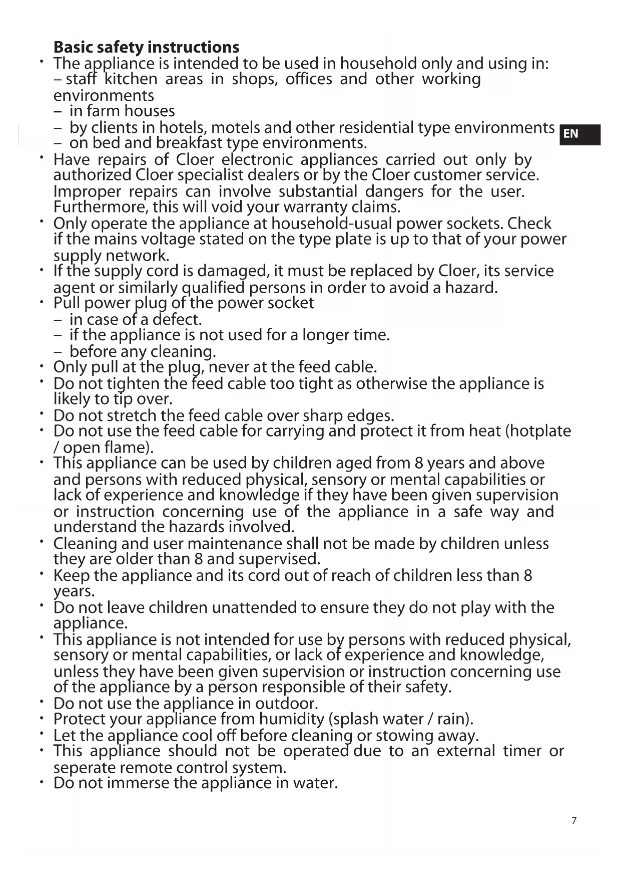 Have repairs of Cloer electronic appliances carried out only by authorized Cloer specialist dealers or by the Cloer customer service. Improper repairs can involve substantial dangers for the user. Furthermore, this will void your warranty claims.