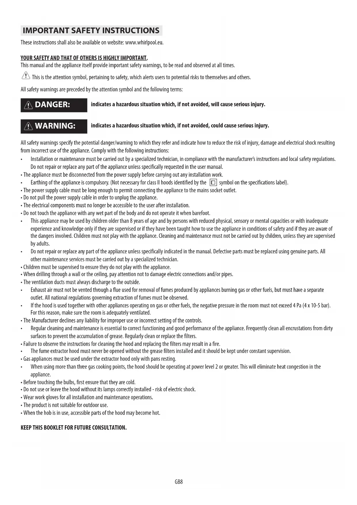 - When the hob is in use, accessible parts of the hood may become hot. KEEP THIS BOOKLET FOR FUTURE CONSULTATION.