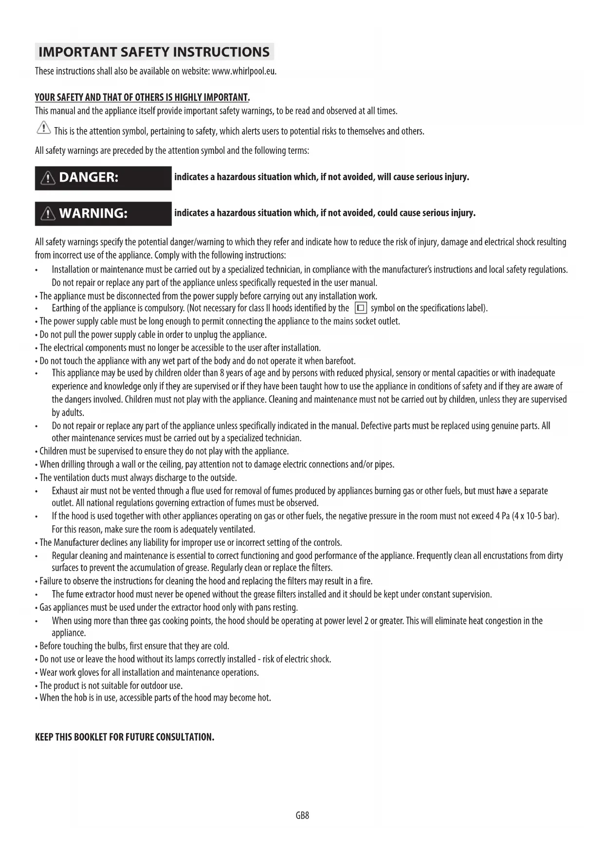 These instructions shall also be available on website: www.whirlpool.eu. YOUR SAFETY AND THAT OF OTHERS IS HIGHLY IMPORTANT. This manual and the appliance itself provide important safety warnings, to be read and observed at all times. This is the attention symbol, pertaining to safety, which alerts users to potential risks to themselves and others. All safety warnings are preceded by the attention symbol and the following terms: indicates a hazardous situation which, if not avoided, will cause serious injury. indicates a hazardous situation which, if not avoided, could cause serious injury. All safety warnings specify the potential danger/warning to which they refer and indicate how to reduce the risk of injury, damage and electrical shock resulting from incorrect use of the appliance. Comply with the following instructions: