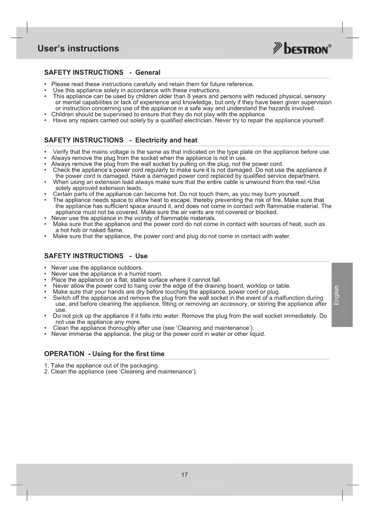 - Have any repairs carried out solely by a qualified electrician. Never try to repair the appliance yourself. SAFETY INSTRUCTIONS - Electricity and heat