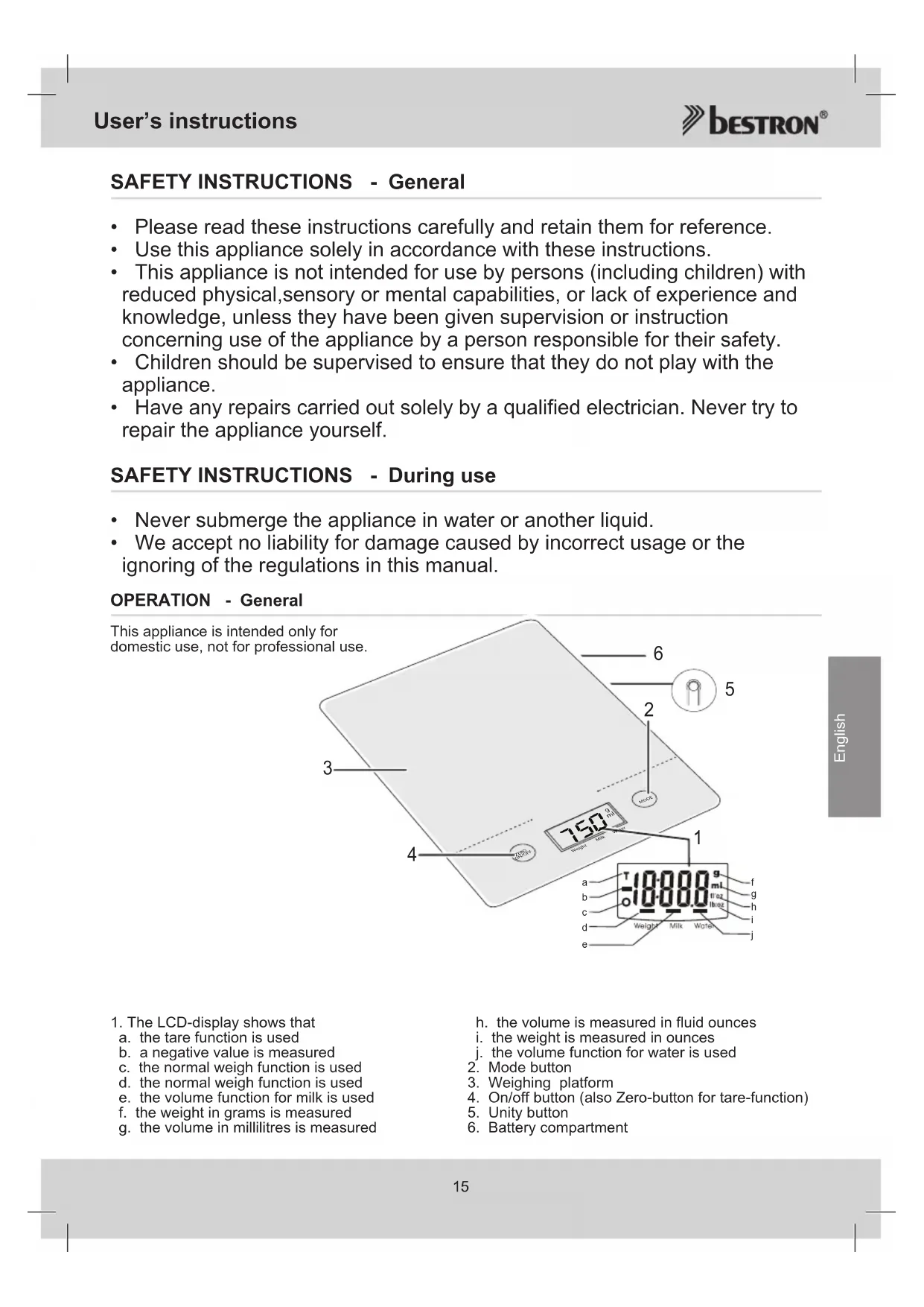 - We accept no liability for damage caused by incorrect usage or the ignoring of the regulations in this manual. OPERATION - General This appliance is intended only for domestic use, not for professional use. 1. The LCD-display shows that a. the tare function is used b. a negative value is measured c. the normal weigh function is used d. the normal weigh function is used e. the volume function for milk is used f. the weight in grams is measured g. the volume in millilitres is measured h. the volume is measured in fluid ounces i. the weight is measured in ounces j. the volume function for water is used2. Mode button3. Weighing platform4. On/off button (also Zero-button for tare-function)5. Unity button6. Battery compartment