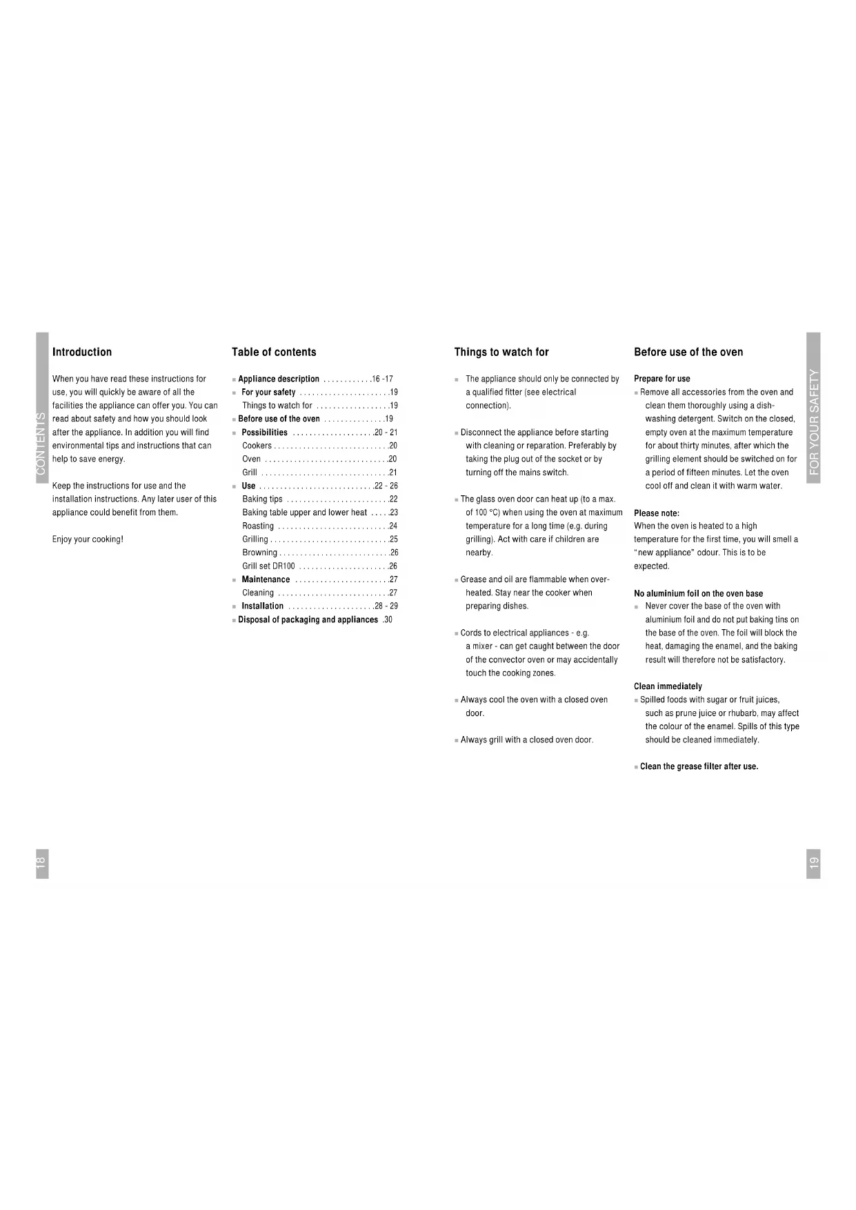 The appliance should only be connected by a qualified fitter (see electrical connection). ■ Disconnect the appliance before starting with cleaning or reparation. Preferably by taking the plug out of the socket or by turning off the mains switch. ■ The glass oven door can heat up (to a max. of 100 °C) when using the oven at maximum temperature for a long time (e.g. during grilling). Act with care if children are nearby. ■ Grease and oil are flammable when over- heated. Stay near the cooker when preparing dishes. ■ Cords to electrical appliances - e.g. a mixer - can get caught between the door of the convector oven or may accidentally touch the cooking zones. ■ Always cool the oven with a closed oven door. ■ Always grill with a closed oven door. Before use of the oven Prepare for use ■ Remove all accessories from the oven and clean them thoroughly using a dish- washing detergent. Switch on the closed, empty oven at the maximum temperature for about thirty minutes, after which the grilling element should be switched on for a period of fifteen minutes. Let the oven cool off and clean it with warm water. Please note: When the oven is heated to a high temperature for the first time, you will smell a “new appliance” odour. This is to be expected. No aluminium foil on the oven base