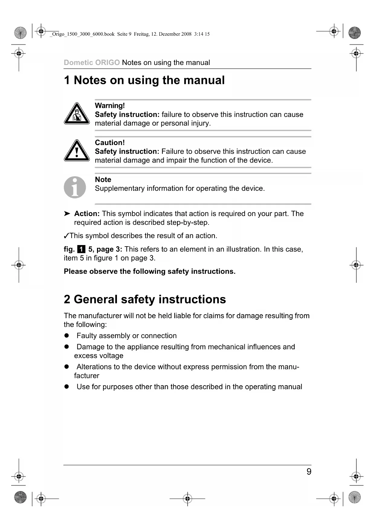 Note Supplementary information for operating the device. ➤ Action: This symbol indicates that action is required on your part. The required action is described step-by-step. ✓ This symbol describes the result of an action. fig. 1 5, page 3: This refers to an element in an illustration. In this case, item 5 in figure 1 on page 3. Please observe the following safety instructions. 2 General safety instructions The manufacturer will not be held liable for claims for damage resulting from the following: z Faulty assembly or connection z Damage to the appliance resulting from mechanical influences and excess voltage z Alterations to the device without express permission from the manu- facturer z Use for purposes other than those described in the operating manual _Origo_1500_3000_6000.book Seite 9 Freitag, 12. Dezember 2008 3:14 15General safety instructions Dometic ORIGO