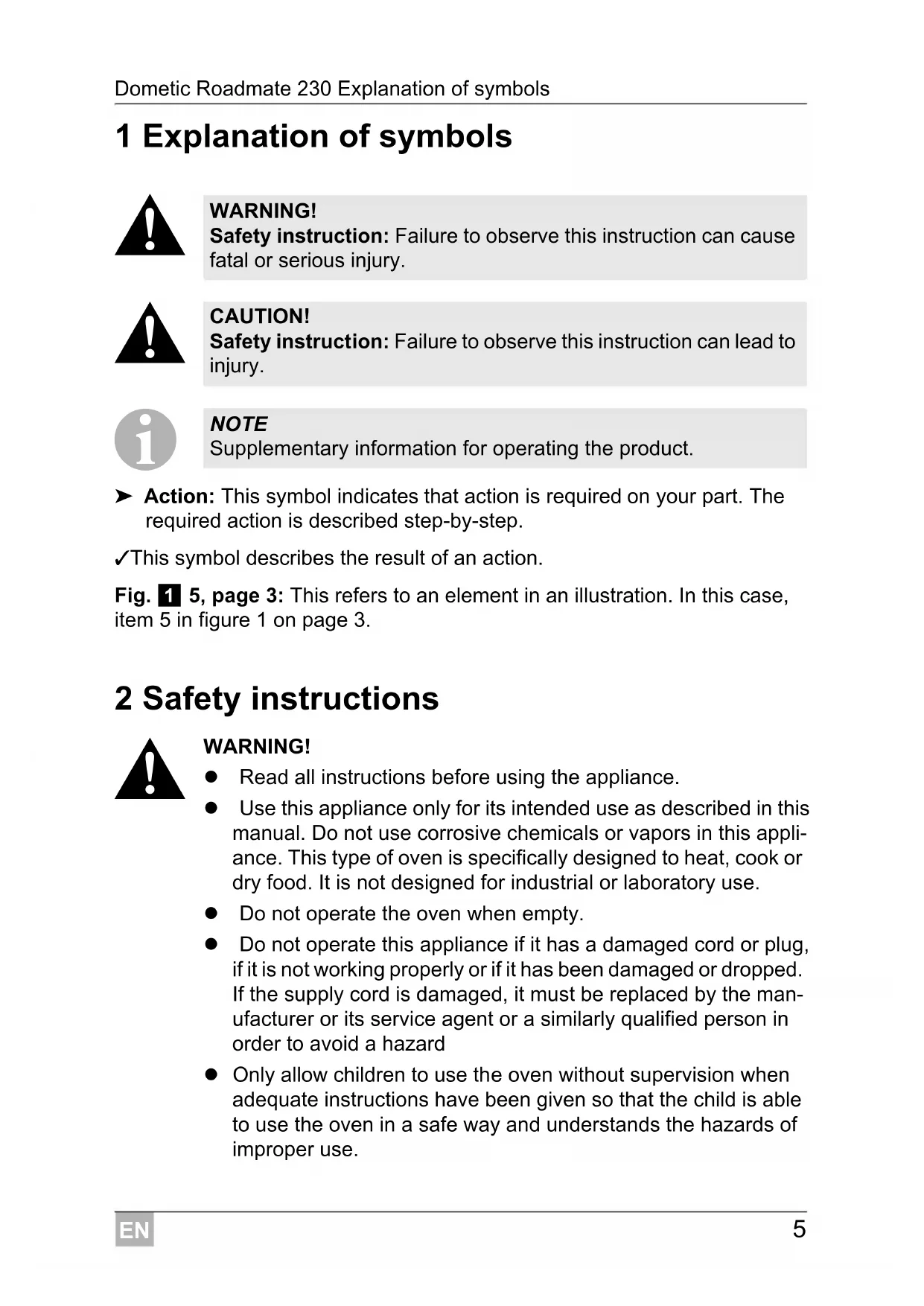 NOTE Supplementary information for operating the product.EN Safety instructions Dometic Roadmate 230