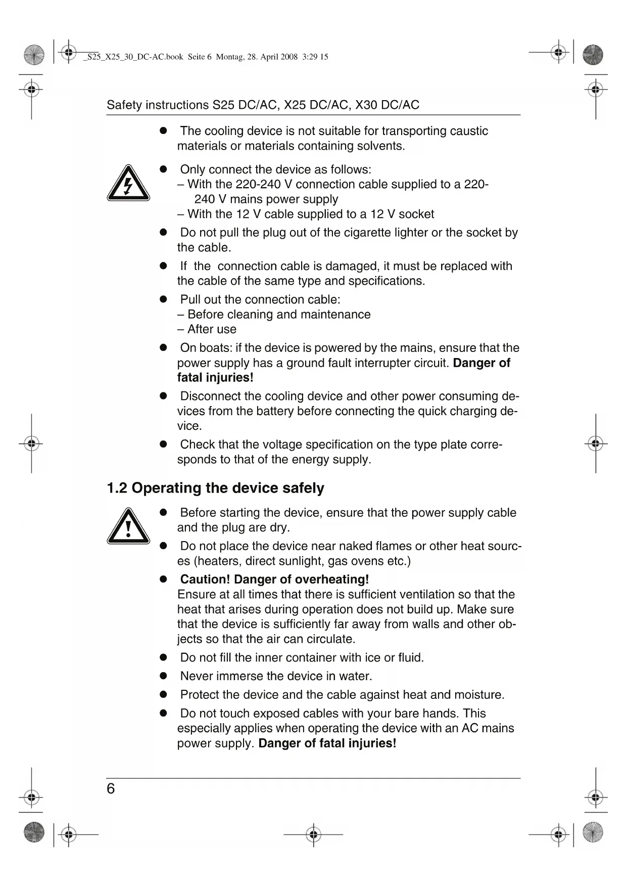 z Do not operate the device if it is visibly damaged. z Ensure that the ventilation slots are not covered. z This device may only be repaired by qualified personnel. Inadequate repairs can lead to considerable hazards. z Do not use electrical devices inside the cooler unless they are recommended by the manufacturer for the purpose. z Persons (including children) whose physical, sensory or mental capabilities or lack of experience and knowledge prevents them from using the appliance safely should not use this appliance without initial supervision or instruction by a responsible person. z Electronic devices are not toys. Always keep and use the device out of the reach of children. z Children must be supervised to ensure that they do not play with the device. z Food may only be stored in its original packaging or in suitable containers. _S25_X25_30_DC-AC.book Seite 5 Montag, 28. April 2008 3:29 15Safety instructions S25 DC/AC, X25 DC/AC, X30 DC/AC
