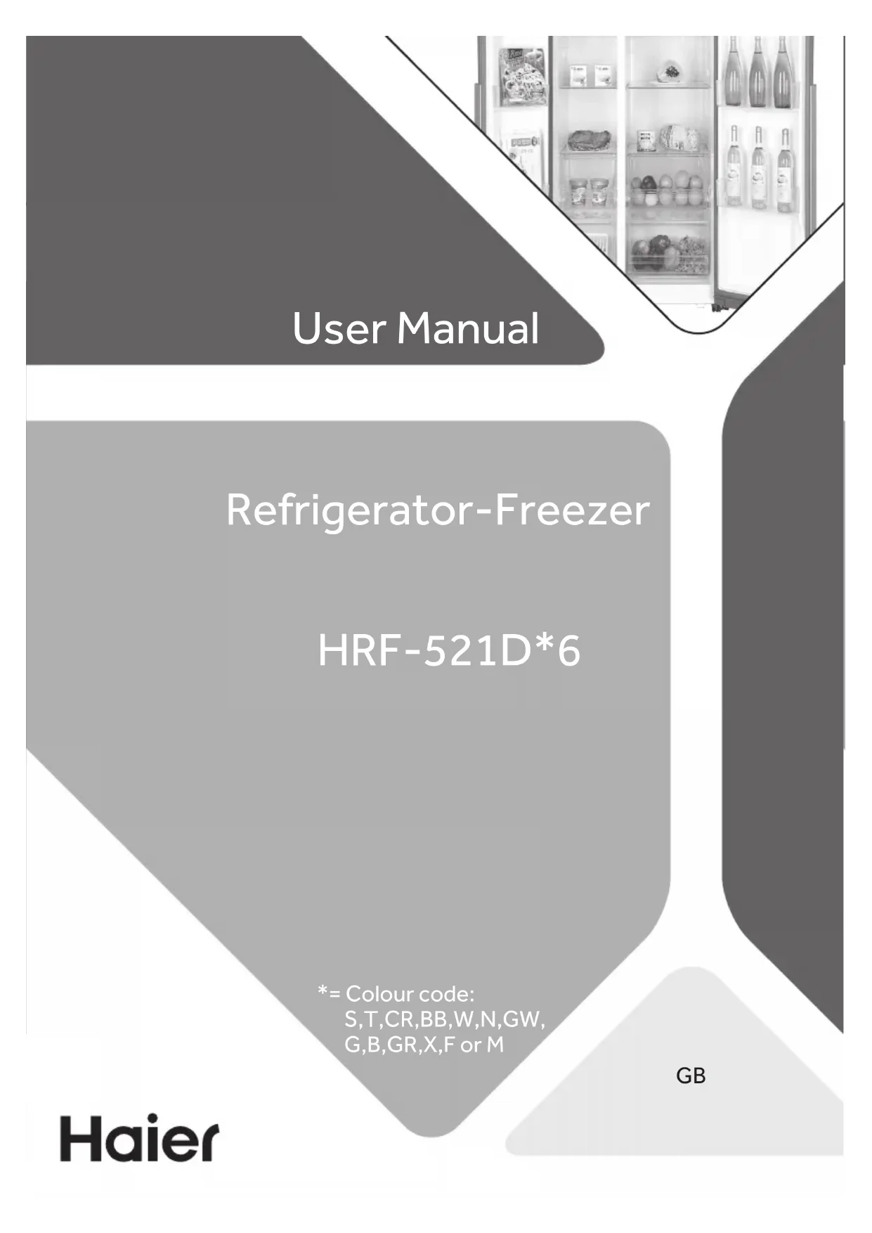 User Manual Refrigerator-Freezer HRF-521D*6 *= Colour code: S,T,CR,BB,W,N,GW, G,B,GR,X,F or MGB GB Thank You Legend Warning – Important Safety information General information and tips Environmental information Disposal Help protect the environment and human health. Put the packaging in applicable containers to recycle it. Help to recycle waste of electrical and electronic ap- pliances. Do not dispose appliances marked with this symbol with the household waste. Return the product to your local recycling facility or contact your municipal oce. Thank you for purchasing a Haier Product. Please read these instructions carefully before using this appliance. The instructions con- tain important information which will help you get the best out of the appliance and ensure safe and proper installation, use and maintenance. Keep this manual in a convenient place so you can always refer to it for the safe and proper use of the appliance. If you sell the appliance, give it away, or leave it behind when you move house, make sure you also pass this manual so that the new owner can become familiar with the appliance and safety warnings. WARNING! Risk of injury or suocation! Refrigerants and gases must be disposed of professionally. Ensure that the tubing of the refrigerant circuit is not damaged before being properly disposed of. Disconnect the appliance from the mains supply. Cut o the mains cable and dispose of it. Remove the trays and drawers as well as the door catch and seals, to prevent children and pets to get closed in the appliance.