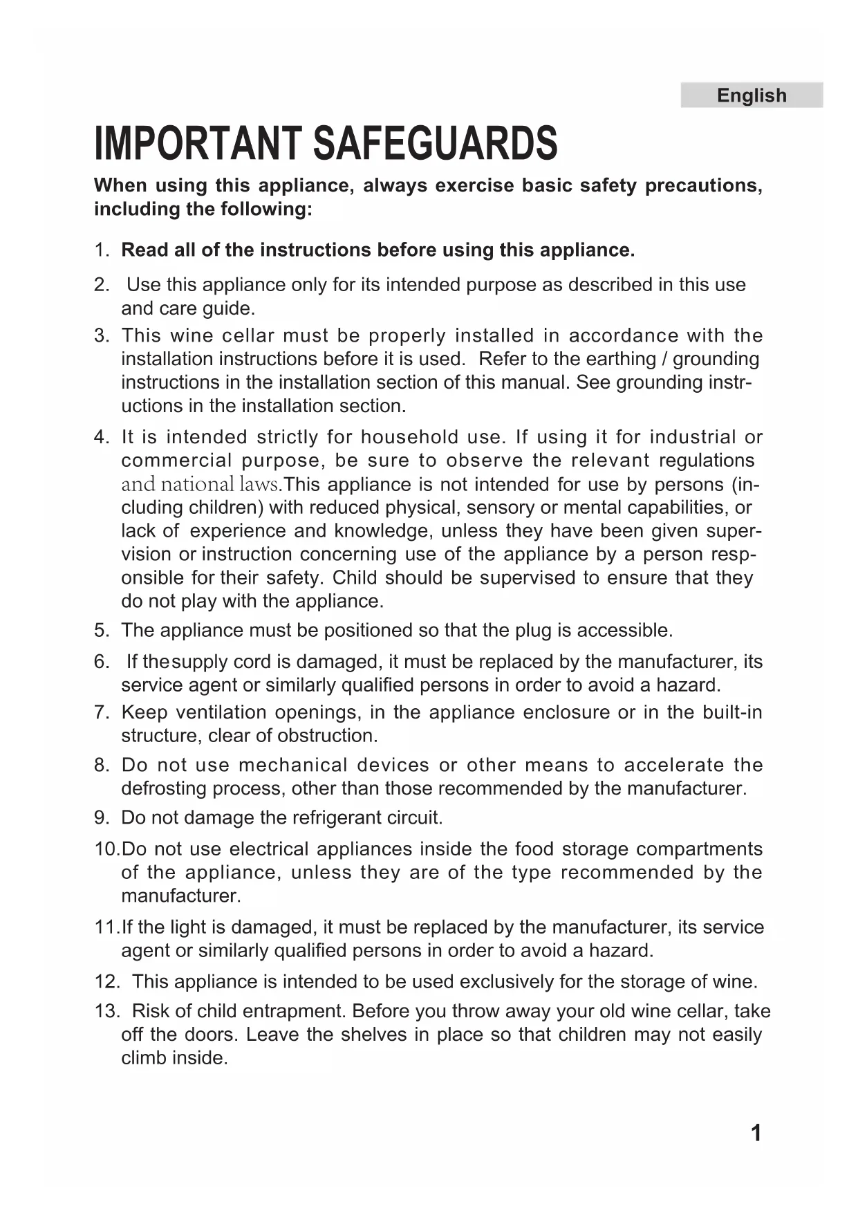 12. This appliance is intended to be used exclusively for the storage of wine.