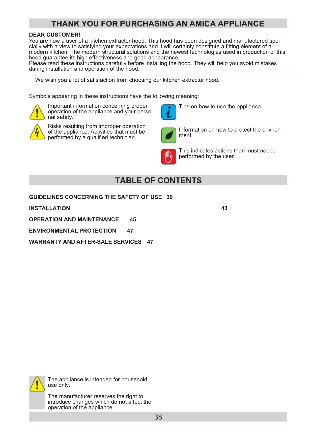 THANK YOU FOR PURCHASING AN AMICA APPLIANCE Symbols appearing in these instructions have the following meaning: