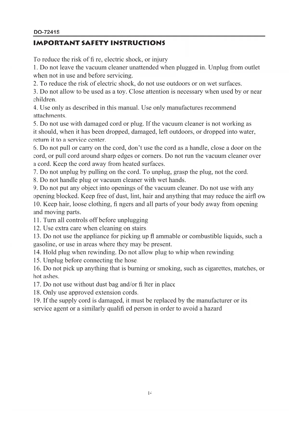5. Do not use with damaged cord or plug. If the vacuum cleaner is not working as