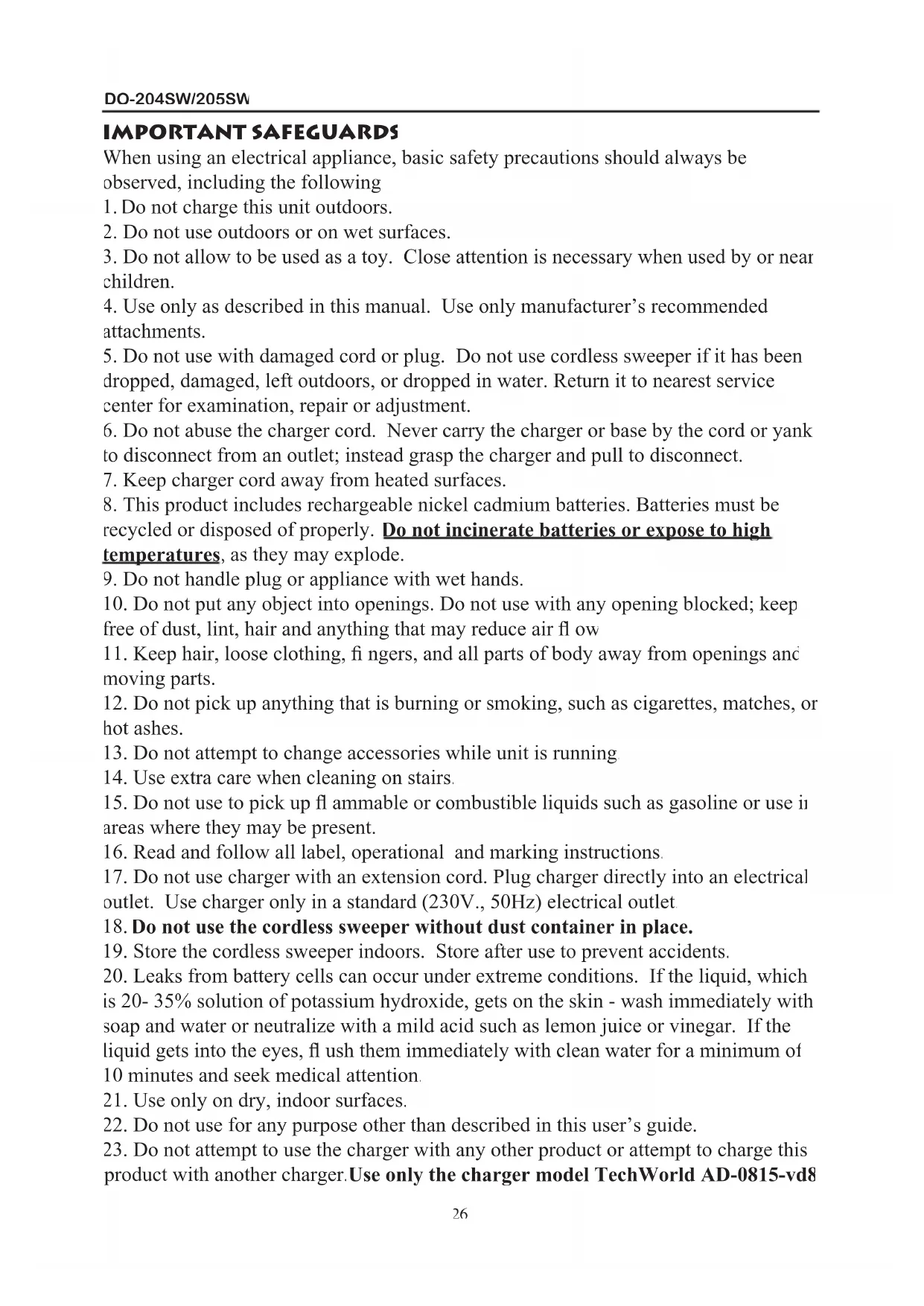 5. Do not use with damaged cord or plug. Do not use cordless sweeper if it has been