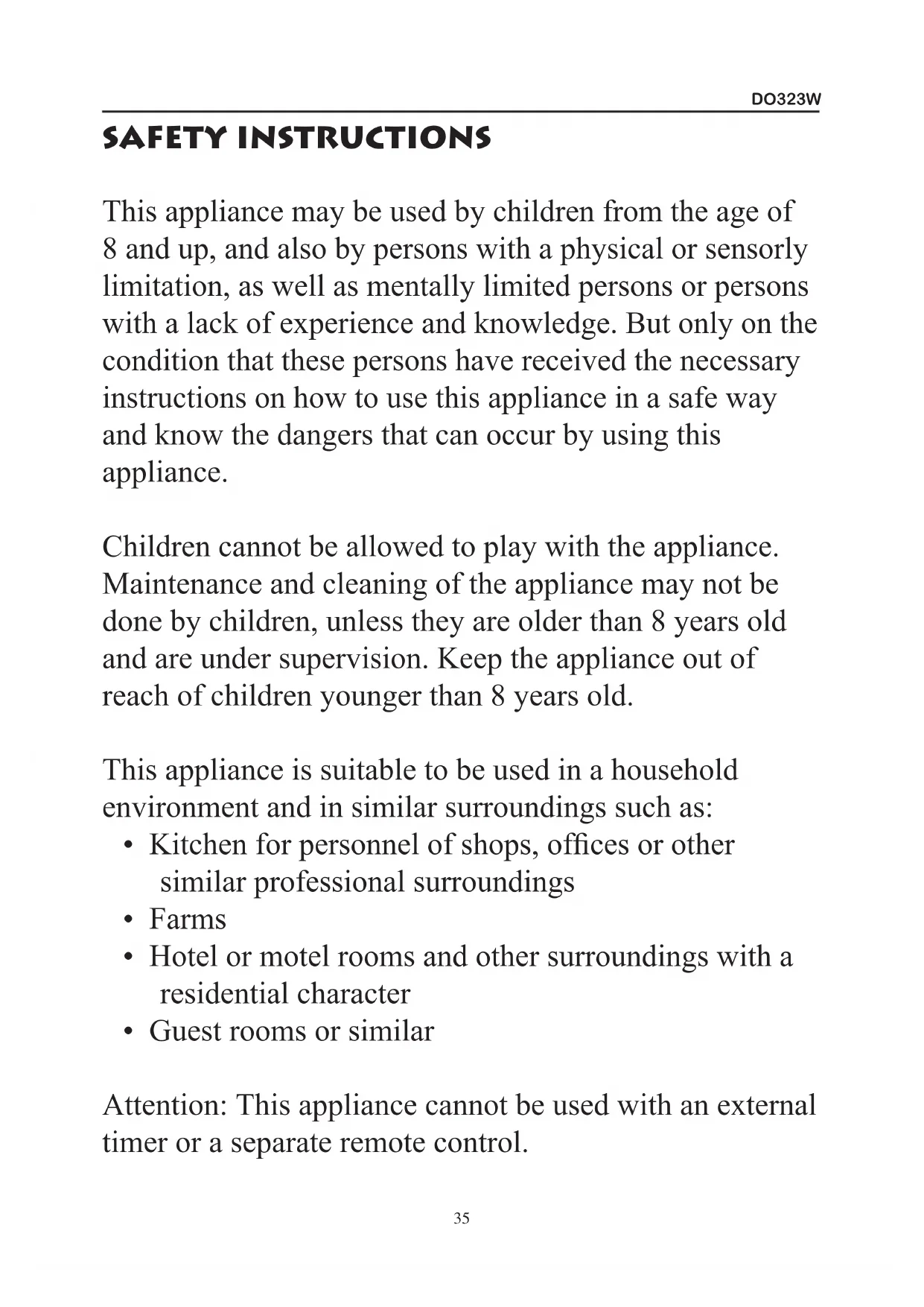 - Guest rooms or similar Attention: This appliance cannot be used with an external timer or a separate remote control.DO323W