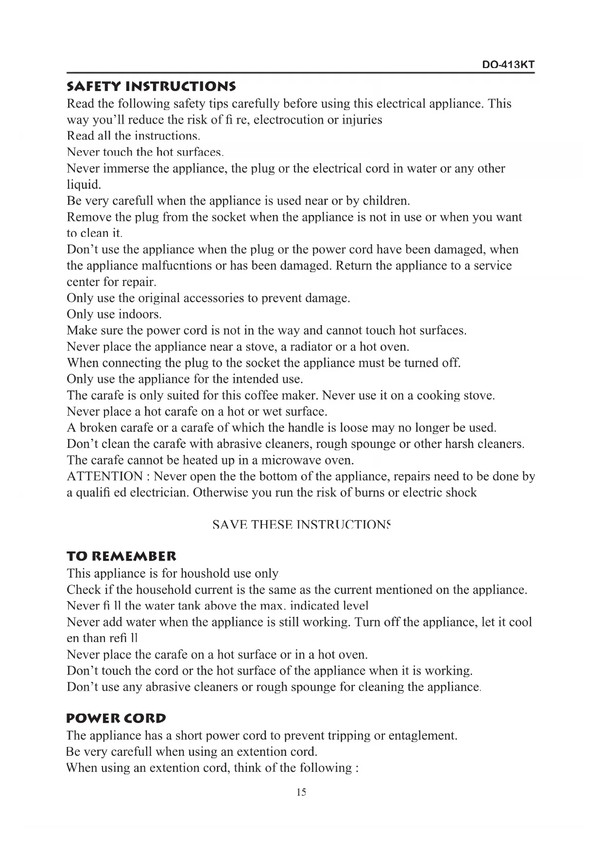 413KT SAFETY INSTRUCTIONS Read the following safety tips carefully before using this electrical appliance. This