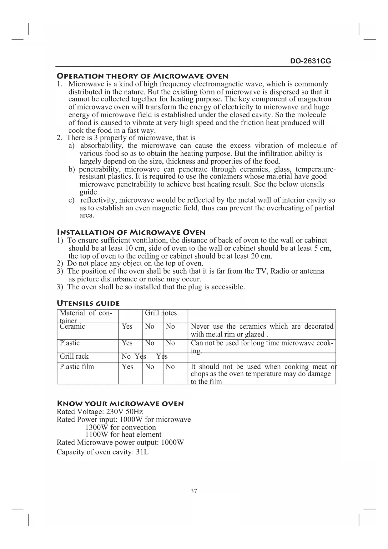Utensils guide Material of con- tainer Grill notes Ceramic Yes No No Never use the ceramics which are decorated with metal rim or glazed . Plastic Yes No No Can not be used for long time microwave cook- ing. Grill rack No Yes Yes Plastic film Yes No No It should not be used when cooking meat or chops as the oven temperature may do damage to the film Know your microwave oven Rated Voltage: 230V 50Hz Rated Power input: 1000W for microwave 1300W for convection 1100W for heat element Rated Microwave power output: 1000W Capacity of oven cavity: 31LDO-2631CG
