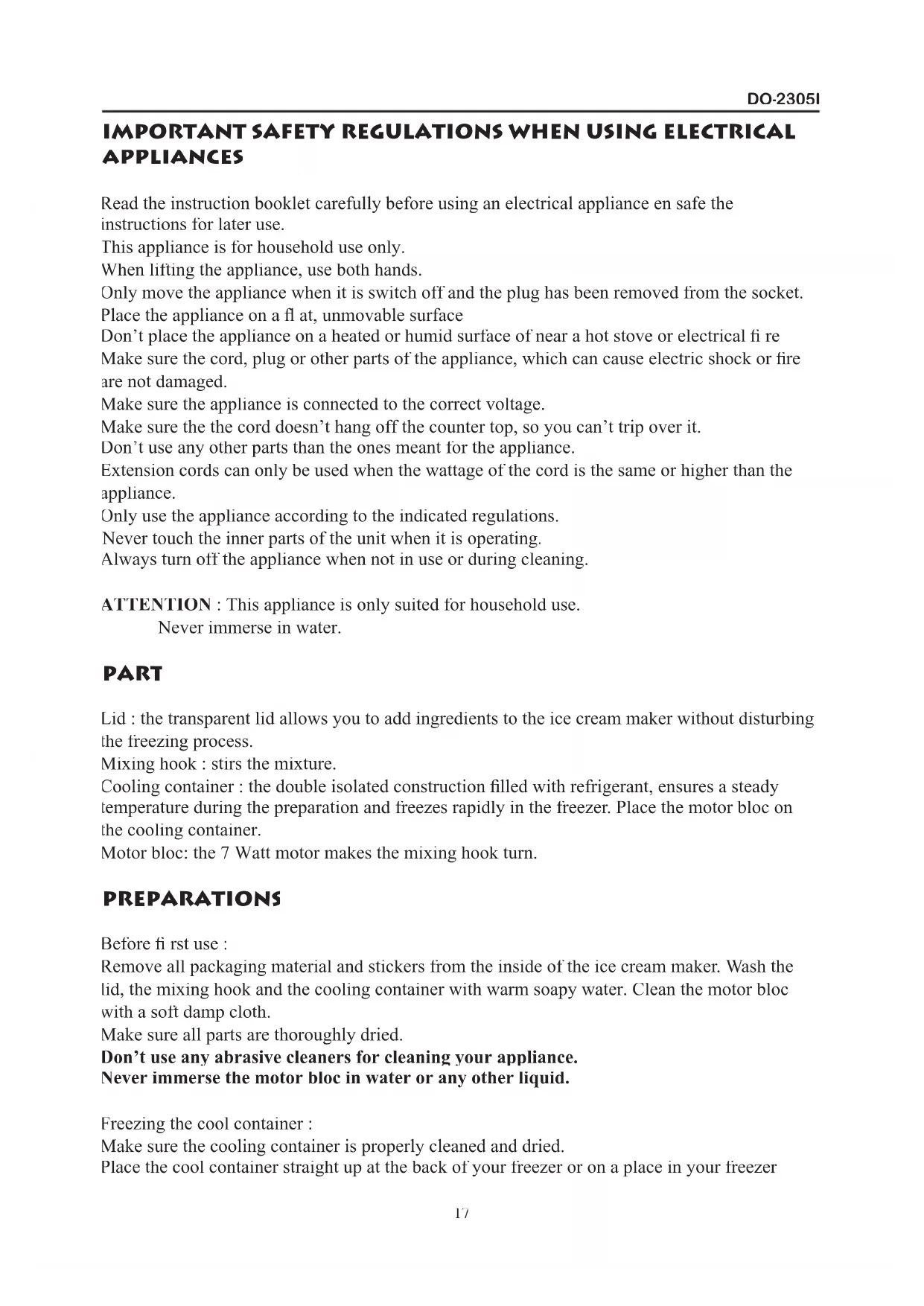 2305I IMPORTANT SAFETY REGULATIONS WHEN USING ELECTRICAL APPLIANCES Read the instruction booklet carefully before using an electrical appliance en safe the