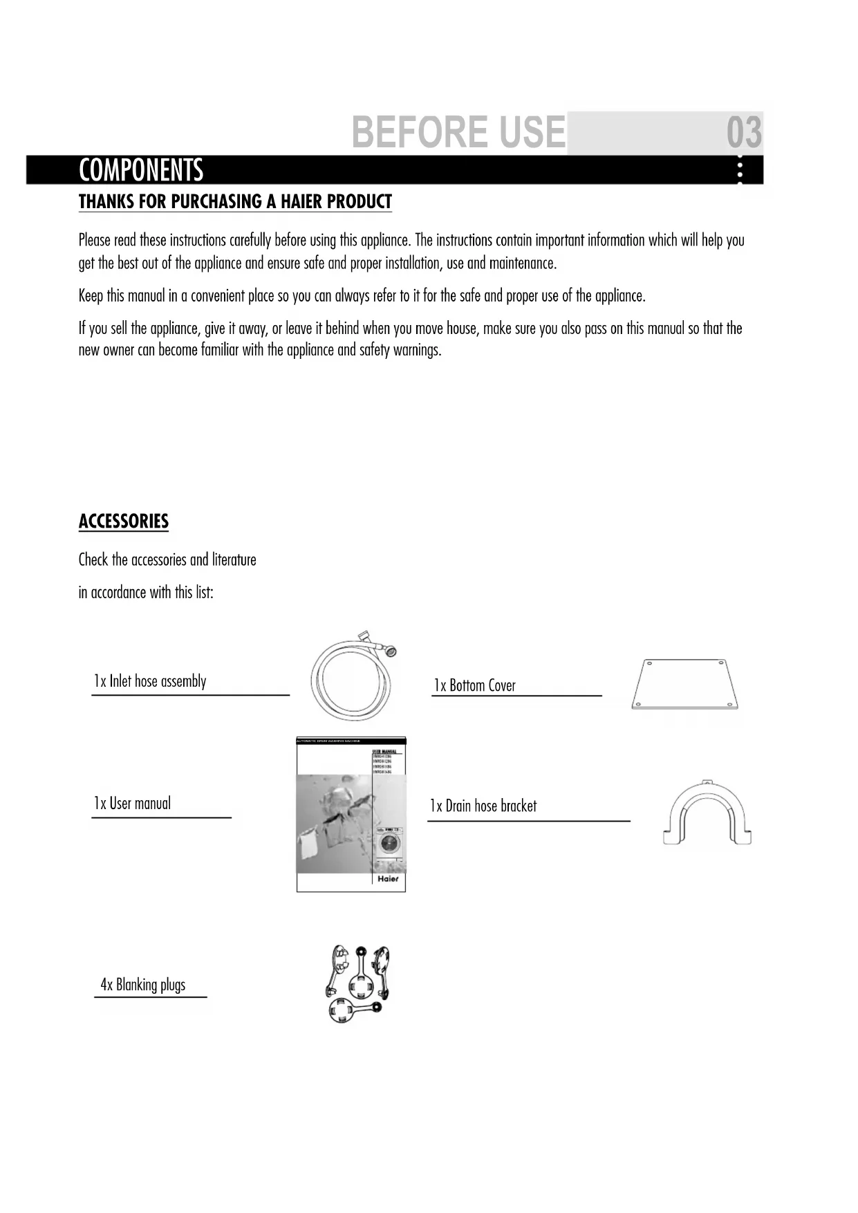 COMPONENTS THANKS FOR PURCHASING A HAIER PRODUCT Please read these instructions carefully before using this appliance. The instructions contain important information which will help you