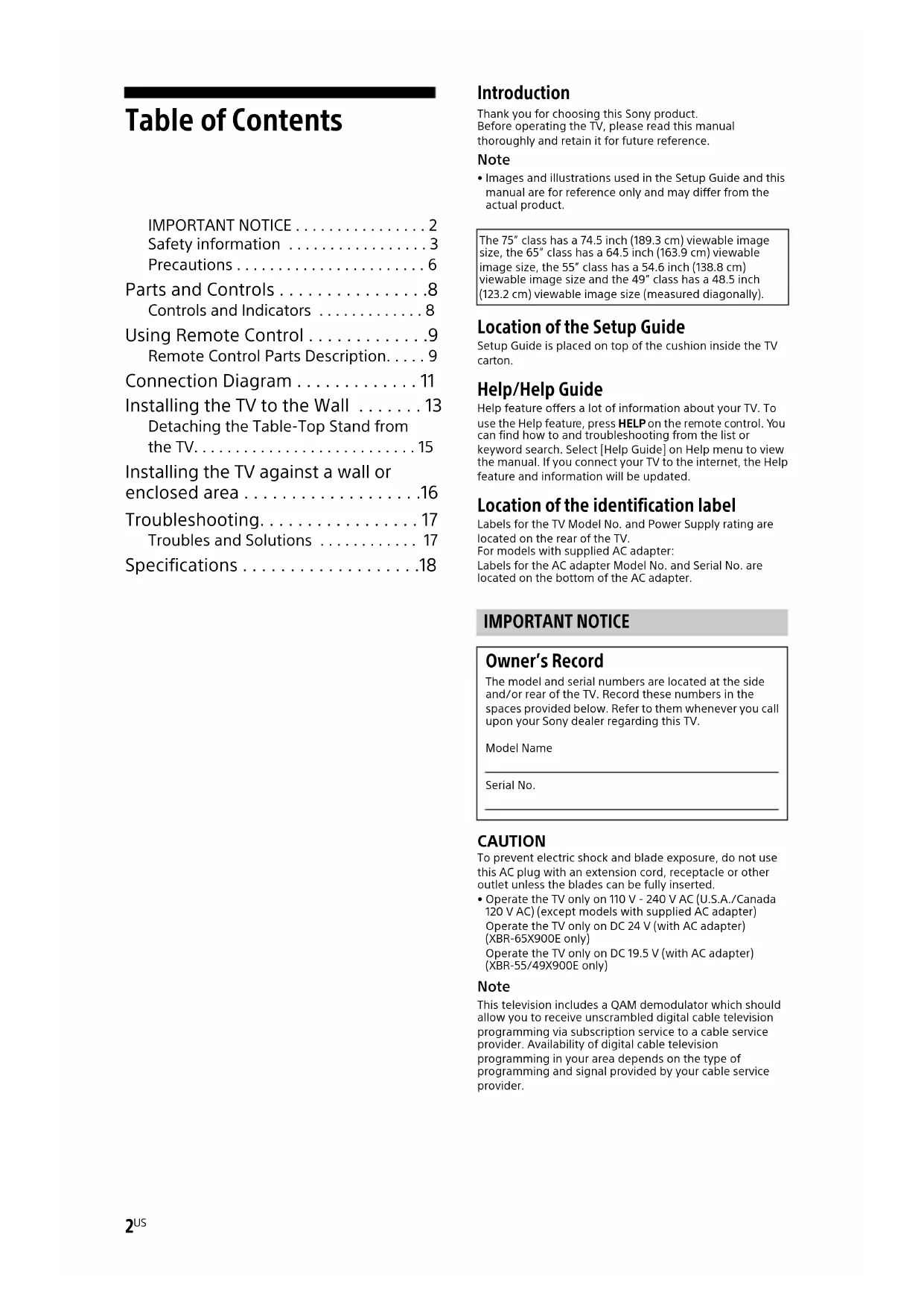 Introduction Thank you for choosing this Sony product.Before operating the TV, please read this manual thoroughly and retain it for future reference. Note • Images and illustrations used in the Setup Guide and this manual are for reference only and may differ from the actual product. Location of the Setup Guide Setup Guide is placed on top of the cushion inside the TV carton. Help/Help Guide Help feature offers a lot of information about your TV. To use the Help feature, press HELP on the remote control. You can find how to and troubleshooting from the list or keyword search. Select [Help Guide] on Help menu to view the manual. If you connect your TV to the internet, the Help feature and information will be updated. Location of the identification label Labels for the TV Model No. and Power Supply rating are located on the rear of the TV.For models with supplied AC adapter:Labels for the AC adapter Model No. and Serial No. are located on the bottom of the AC adapter. CAUTION To prevent electric shock and blade exposure, do not use this AC plug with an extension cord, receptacle or other outlet unless the blades can be fully inserted. • Operate the TV only on 110 V - 240 V AC (U.S.A./Canada 120 V AC) (except models with supplied AC adapter)