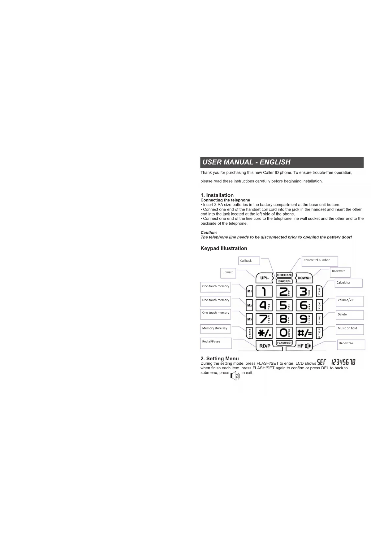 BIG 300 User manual 11x15_8giu.indd 1 13/06/12 11.26USER MANUAL - ENGLISH Thank you for purchasing this new Caller ID phone. To ensure trouble-free operation, please read these instructions carefully before beginning installation.