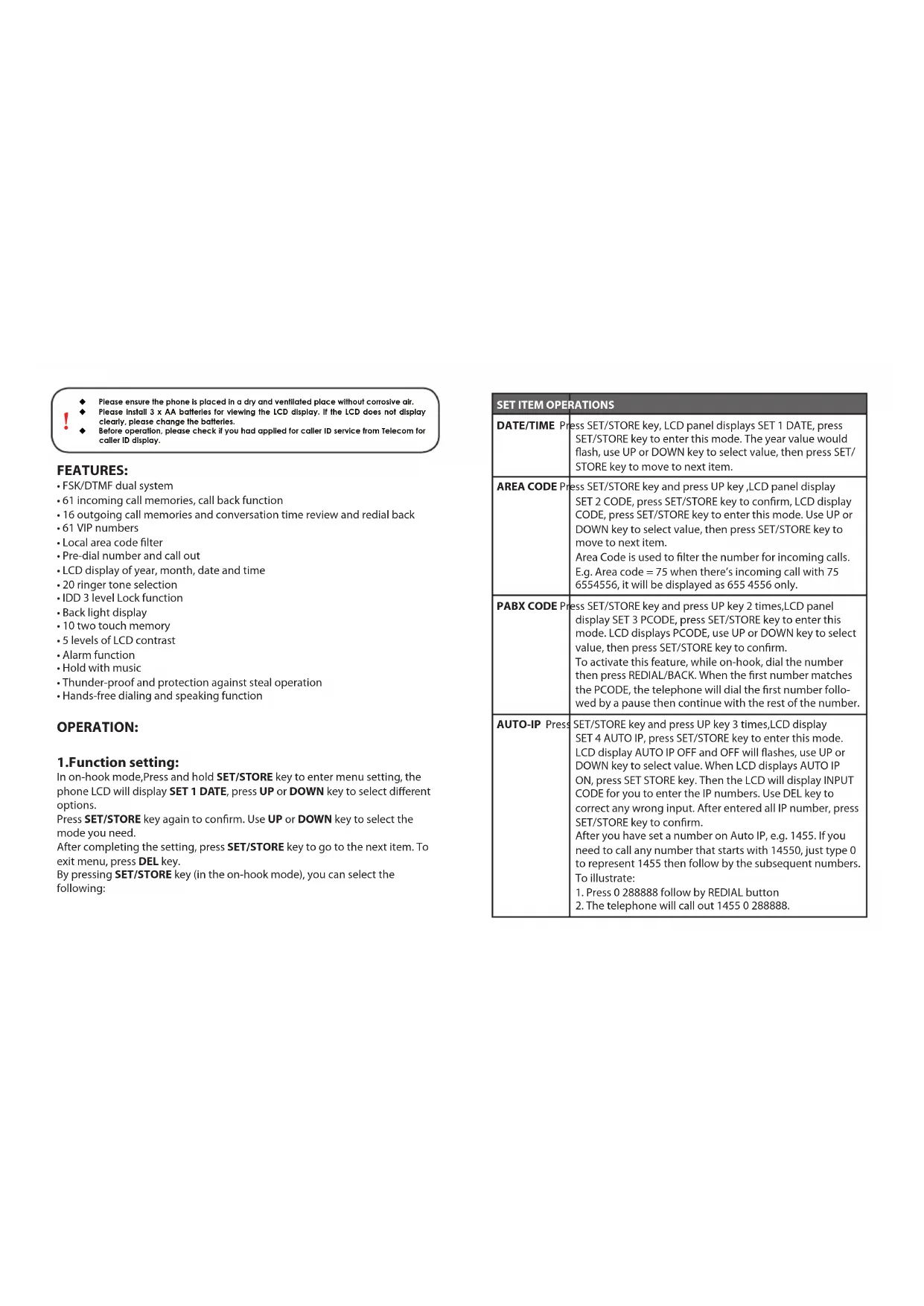 Please ensure the phone is placed in a dry and ventilated place without corrosive air. Please install 3 x AA batteries for viewing the LCD display. If the LCD does not display clearly, please change the batteries. Before operation, please check if you had applied for caller ID service from Telecom for caller ID display.