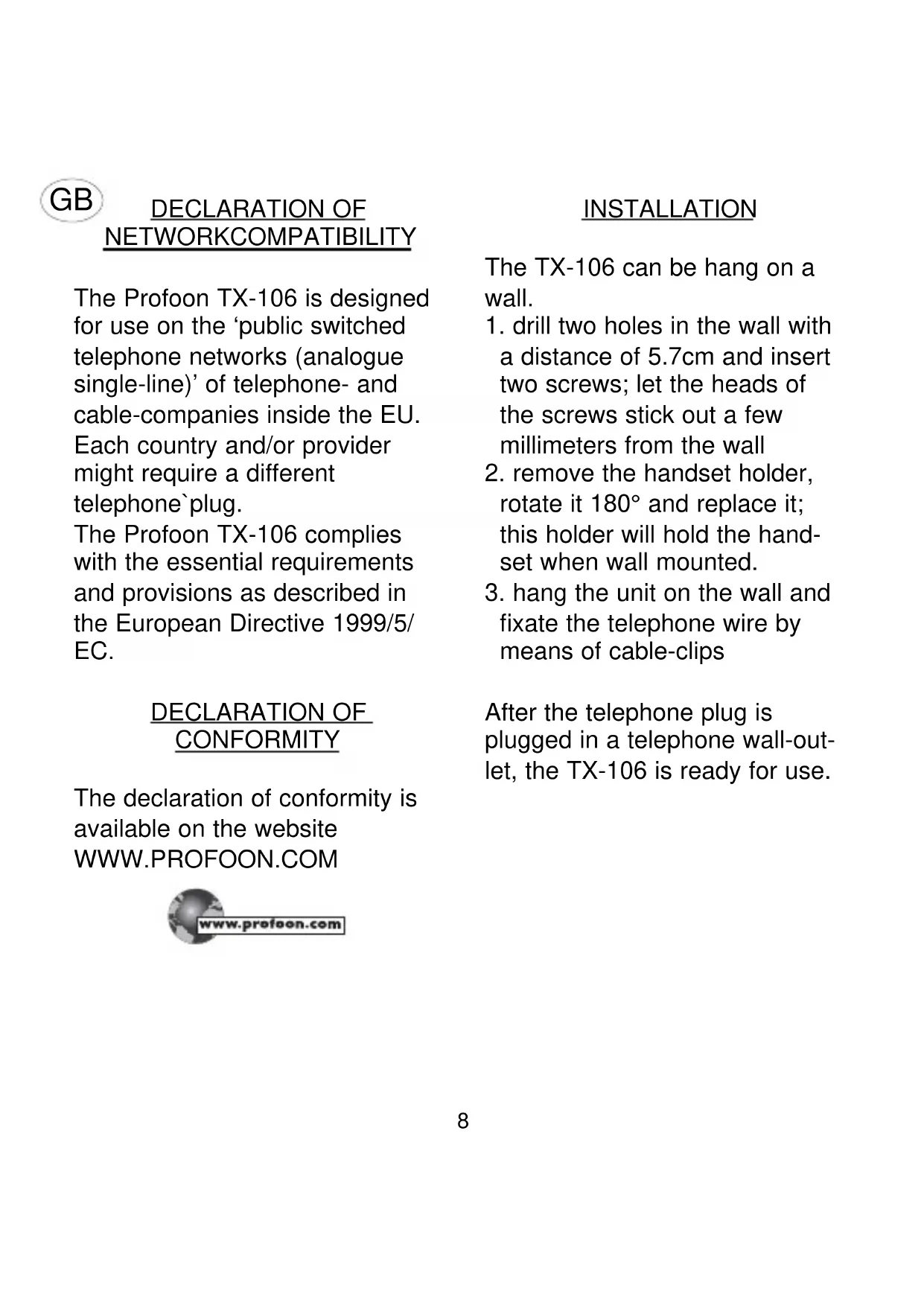 fixate the telephone wire by means of cable-clips After the telephone plug is plugged in a telephone wall-out- let, the TX-106 is ready for use.