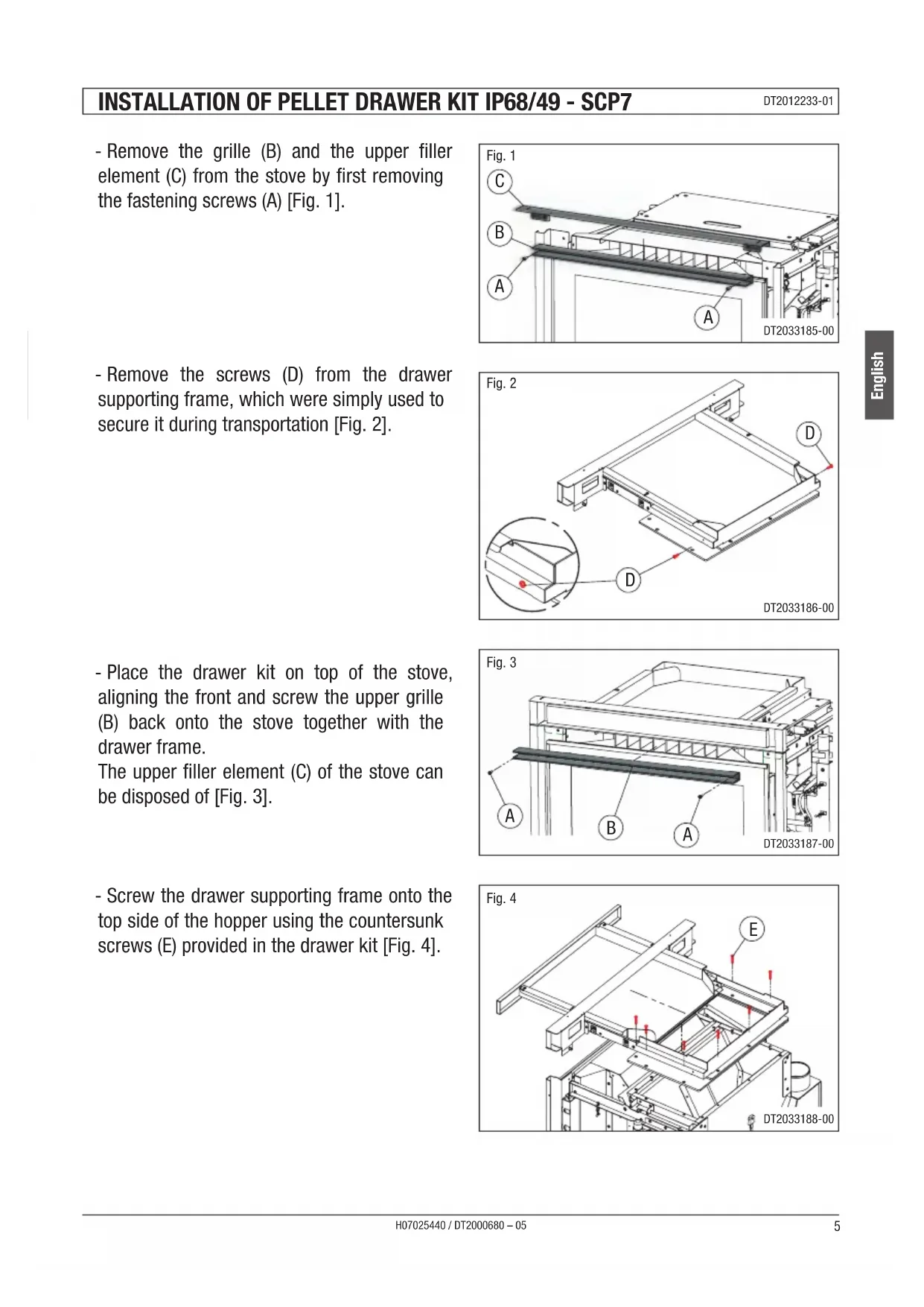 - Remove the grille (B) and the upper filler element (C) from the stove by first removing the fastening screws (A) [Fig. 1].