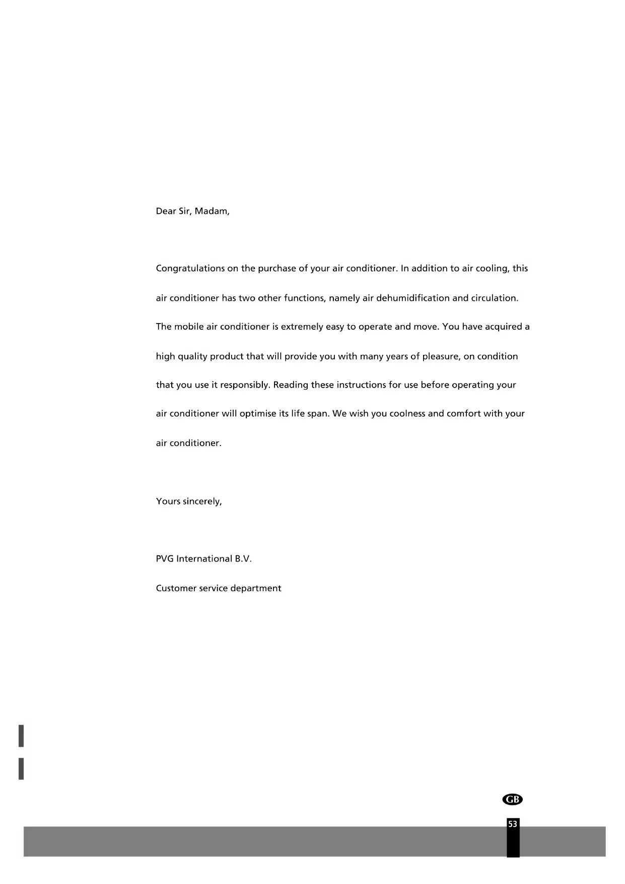 Dear Sir, Madam, Congratulations on the purchase of your air conditioner. In addition to air cooling, this air conditioner has two other functions, namely air dehumidification and circulation. The mobile air conditioner is extremely easy to operate and move. You have acquired a high quality product that will provide you with many years of pleasure, on condition that you use it responsibly. Reading these instructions for use before operating your air conditioner will optimise its life span. We wish you coolness and comfort with your air conditioner. Yours sincerely, PVG International B.V. Customer service departmentA SAFETY INSTRUCTIONS Install the device only when it complies with local regulations, by-laws and s t a n d a rds. The unit is only suitable for use in dry locations, indoors. Check the mains voltage and fre q u e n c y. This unit is only suitable for earthed sockets, connection voltage 220-240 V. / 50 Hz. Before connecting the unit, check the following:
