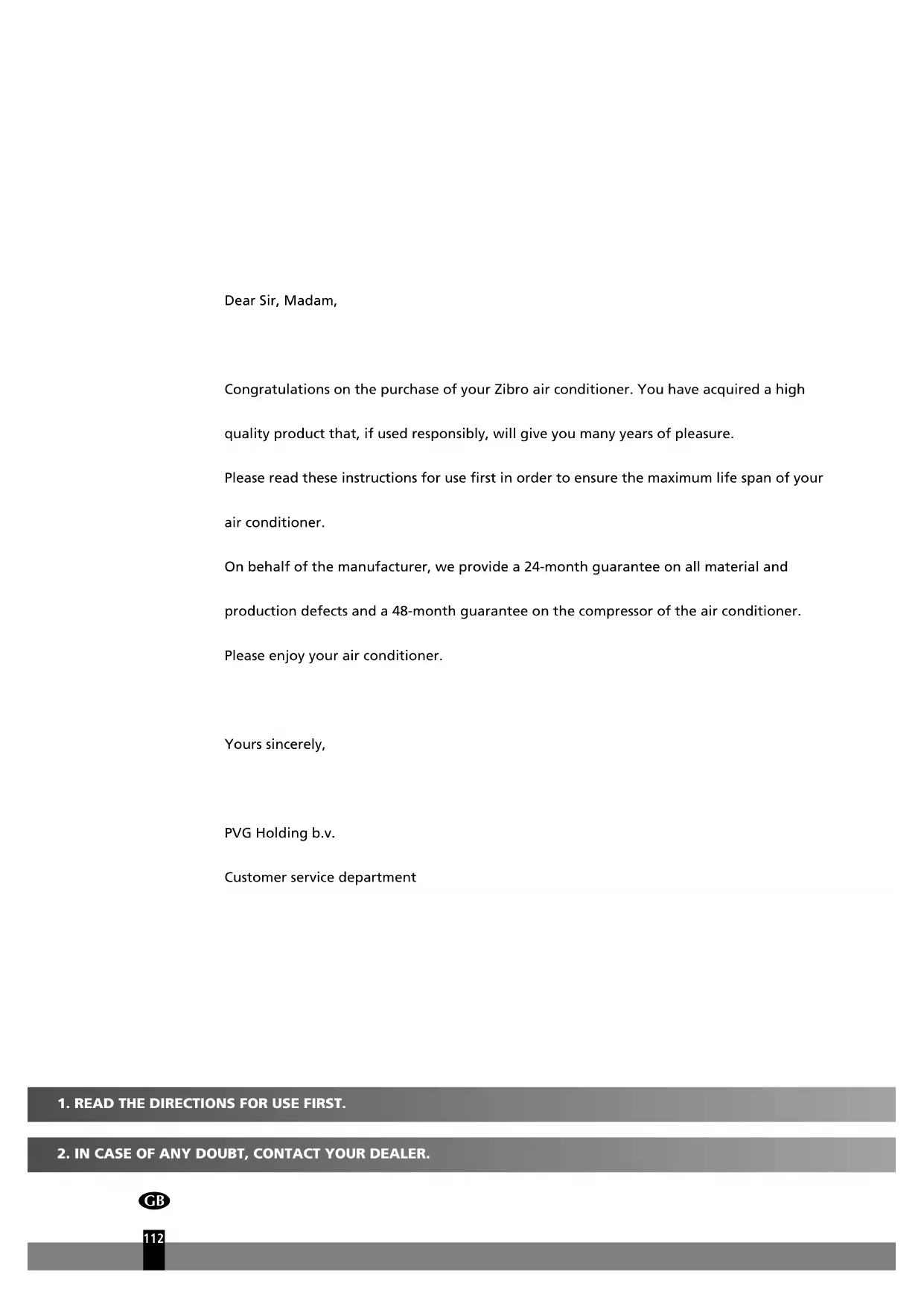 Dear Sir, Madam, Congratulations on the purchase of your Zibro air conditioner. You have acquired a high quality product that, if used responsibly, will give you many years of pleasure. Please read these instructions for use first in order to ensure the maximum life span of your air conditioner. On behalf of the manufacturer, we provide a 24-month guarantee on all material and production defects and a 48-month guarantee on the compressor of the air conditioner. Please enjoy your air conditioner. Yours sincerely, PVG Holding b.v. Customer service department man_S(C)32xx.qxd:man_S18xx 12-02-13 09:58 Page 1124