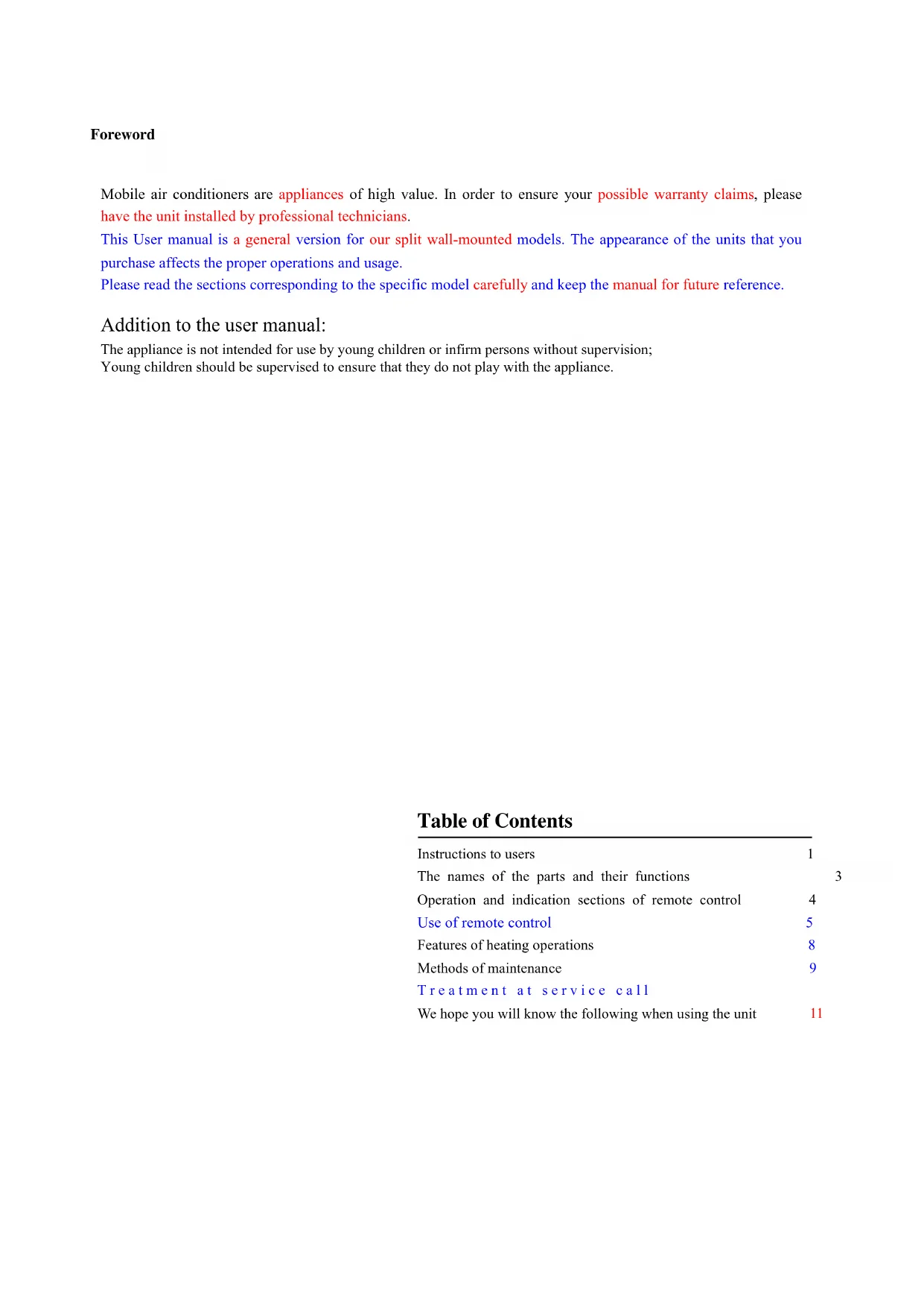 This User manual is a general version for our split wall-mounted models. The appearance of the units that you