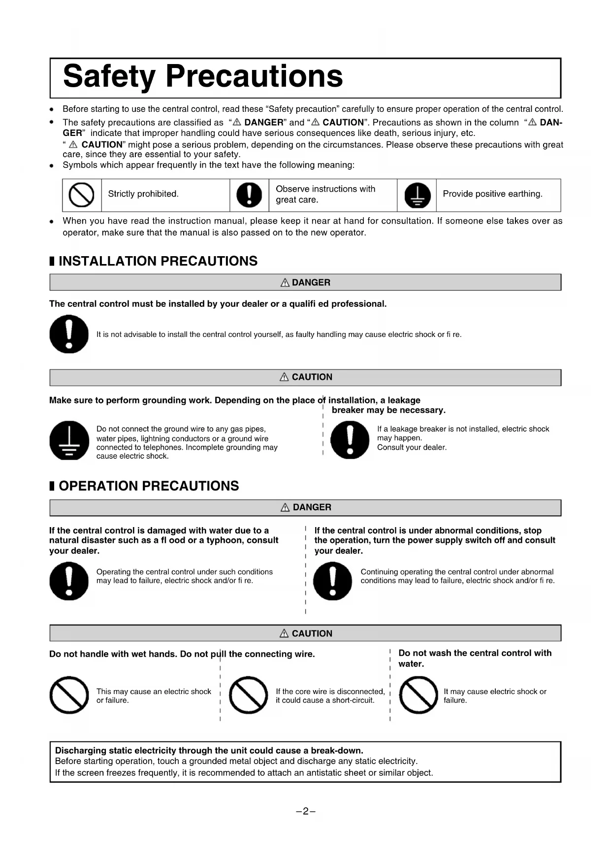 CAUTION If a leakage breaker is not installed, electric shock may happen.Consult your dealer.Do not connect the ground wire to any gas pipes, water pipes, lightning conductors or a ground wire connected to telephones. Incomplete grounding may cause electric shock. If the central control is damaged with water due to a