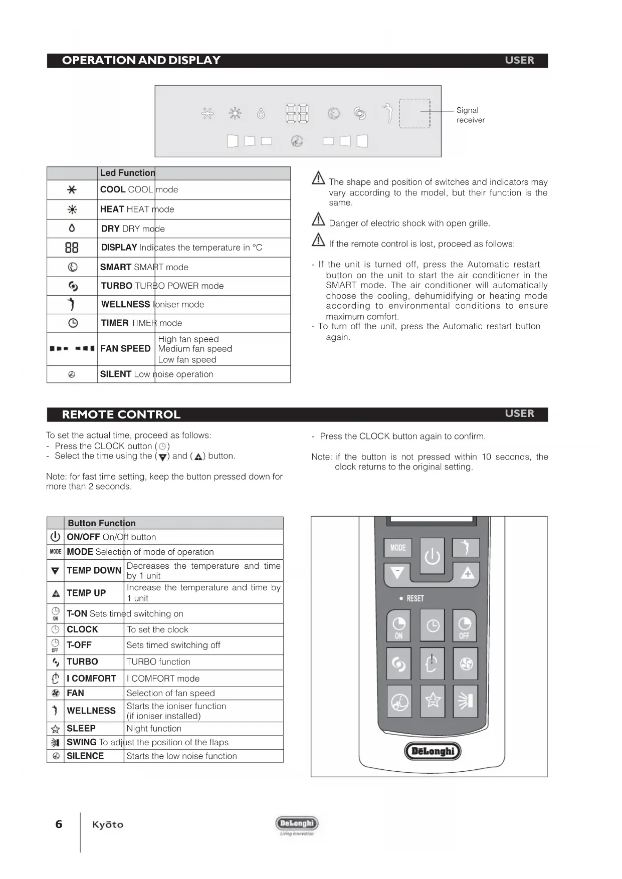 REMOTE CONTROL Led Function COOL COOL mode HEAT HEAT mode DRY DRY mode DISPLAY Indicates the temperature in °C SMART SMART mode TURBO TURBO POWER mode WELLNESS Ioniser mode TIMER TIMER mode FAN SPEED High fan speed Medium fan speed Low fan speed SILENT Low noise operation The shape and position of switches and indicators may vary according to the model, but their function is the same. Danger of electric shock with open grille. If the remote control is lost, proceed as follows: - If the unit is turned off, press the Automatic restart button on the unit to start the air conditioner in the SMART mode. The air conditioner will automatically choose the cooling, dehumidifying or heating mode according to environmental conditions to ensure maximum comfort. - To turn off the unit, press the Automatic restart button again. USER USER Button Function ON/OFF On/Off button MODE Selection of mode of operation TEMP DOWN Decreases the temperature and time by 1 unit TEMP UP Increase the temperature and time by 1 unit T-ON Sets timed switching on CLOCK To set the clock T-OFF Sets timed switching off TURBO TURBO function I COMFORT I COMFORT mode FAN Selection of fan speed WELLNESS Starts the ioniser function (if ioniser installed) SLEEP Night function SWING To adjust the position of the flaps SILENCE Starts the low noise function