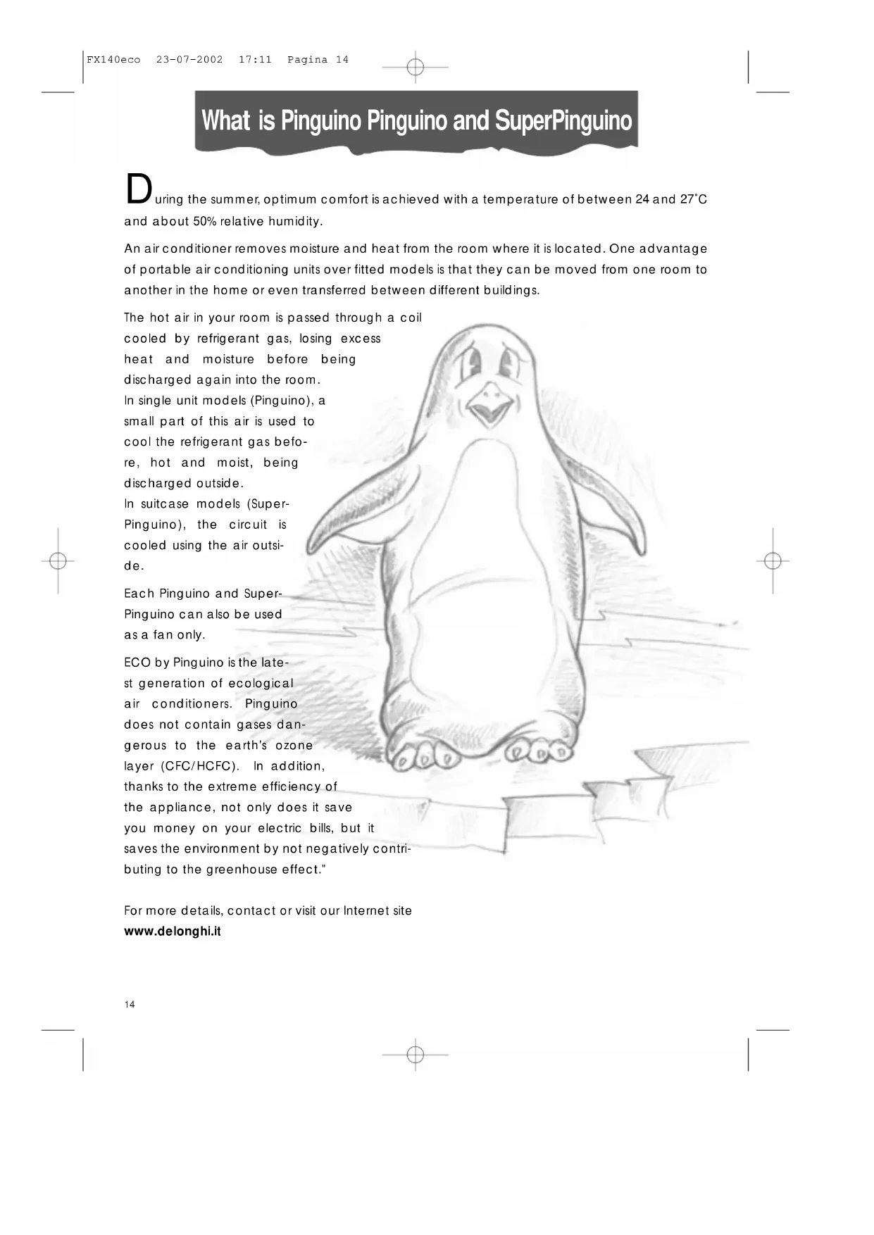 Thank you for having purchased an appliance made by De' Longhi, the international leader in portable air conditioning units. Thanks to our years of experience all around the world we are constantly improving the quality and performance of Pinguino. We are confident that you will be satisfied with your purchase and enjoy the cool comfort created by the Pinguino for many years to come. You should spend some time reading this instruction manual and keep it handy to refer to in order to use your Pinguino in conditions of maximum efficiency and peace of mind.