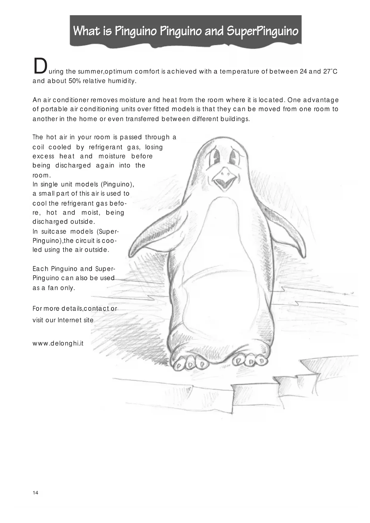 Thank you for having purchased an appliance made by De' Longhi, the international leader in portable air conditioning units. Thanks to our years of experience all around the world we are constantly improving the quality and performance of Pinguino. We are confident that you will be satisfied with your purchase and enjoy the cool comfort created by the Pinguino for many years to come. You should spend some time reading this instruction manual and keep it handy to refer to in order to use your Pinguino in conditions of maximum efficiency and peace of mind.