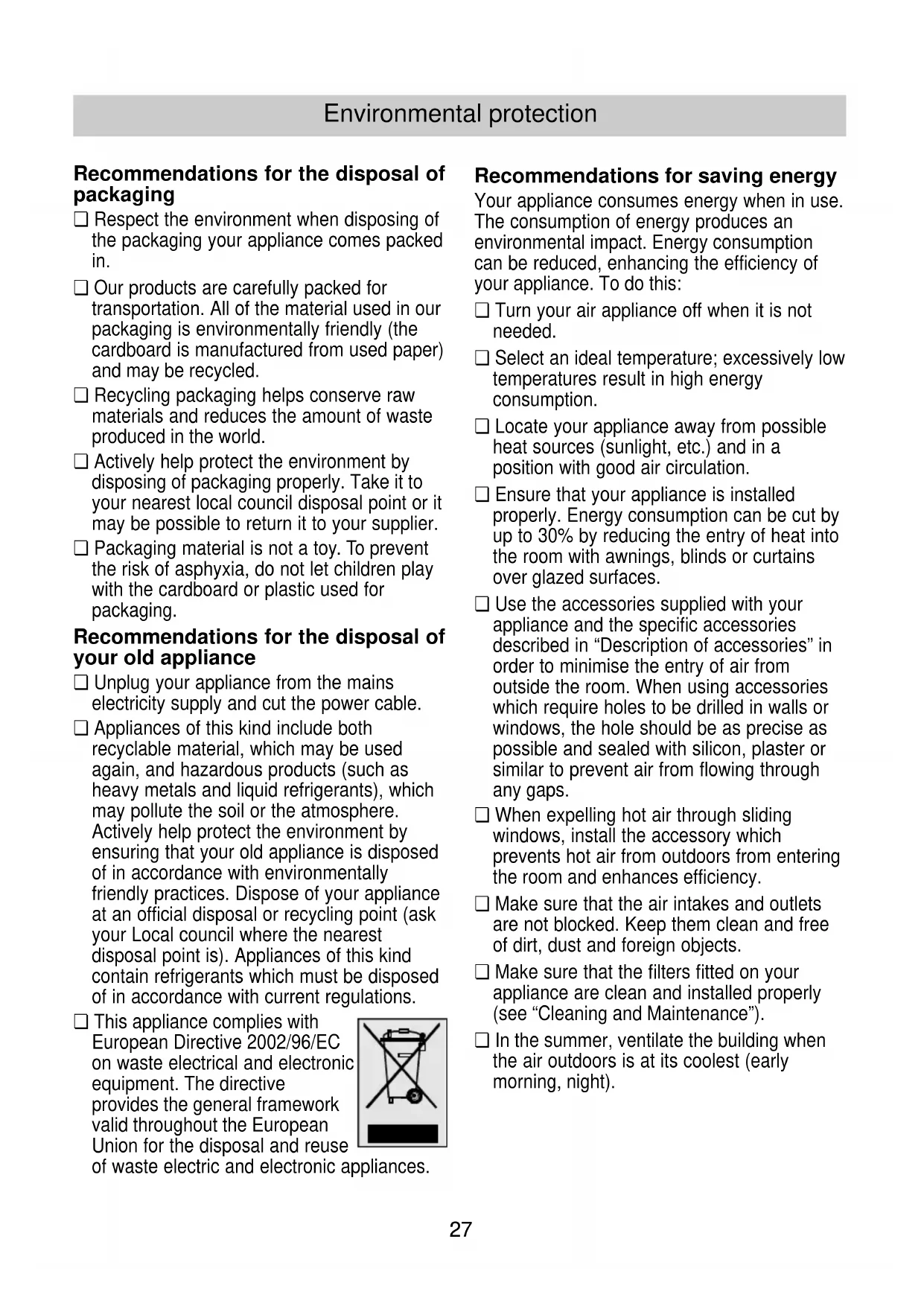 ❏ Turn your air appliance off when it is not