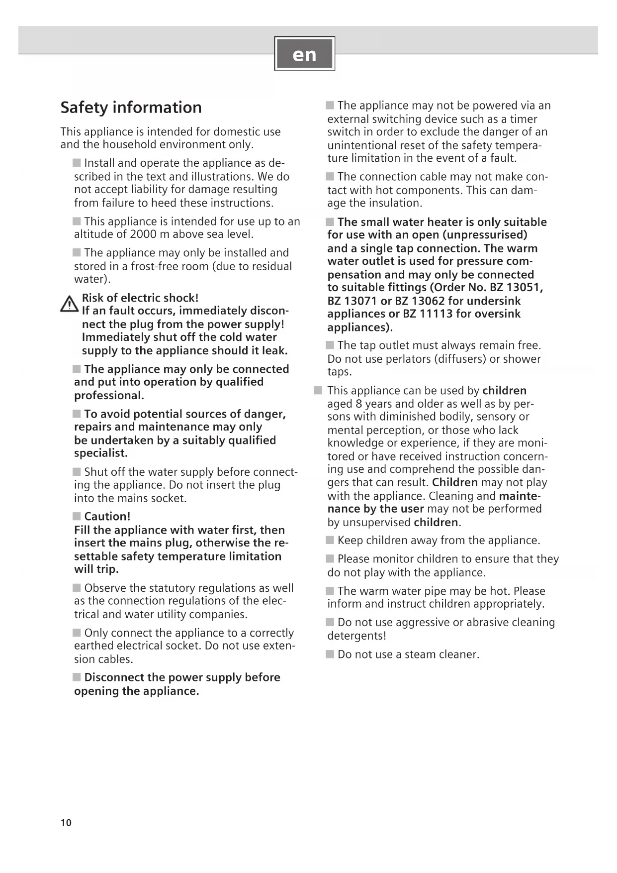 Operating instructions ■ Before using the appliance, please read the instruc-tions carefully and observe them! ■ Important: The appliance may never be exposed to frost! Risk of electric shock!If a fault occurs, immediately disconnect the plug from the power supply!Immediately shut off the cold water supply to the appliance should it leak.Please read and observe the detailed safety instructions at the start of these instructions!