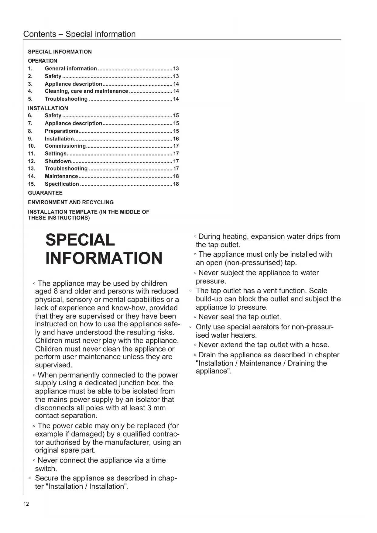 1. General information The chapters "Special Information" and "Operation" are intended for both the user and qualied contractors.The chapter "Installation" is intended for qualied con-tractors.