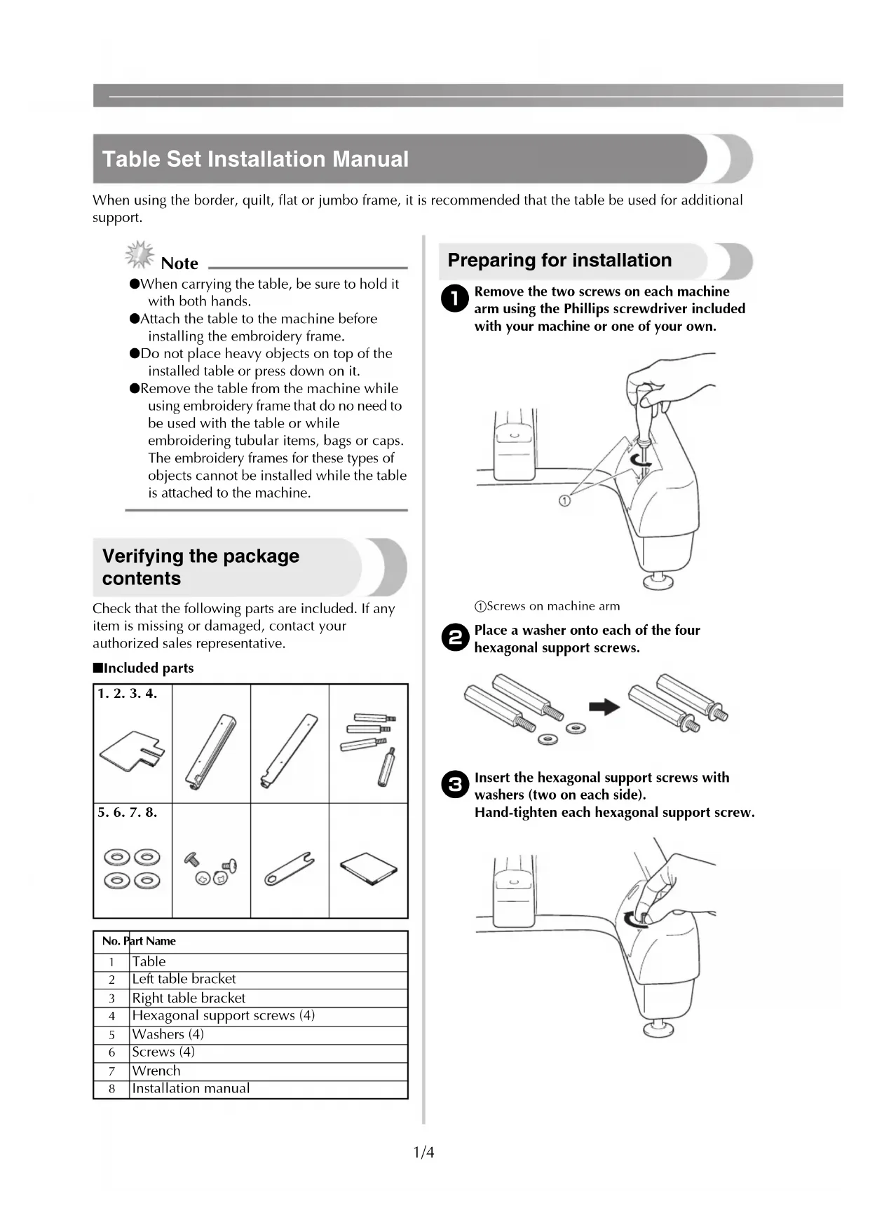 When using the border, quilt, flat or jumbo frame, it is recommended that the table be used for additional