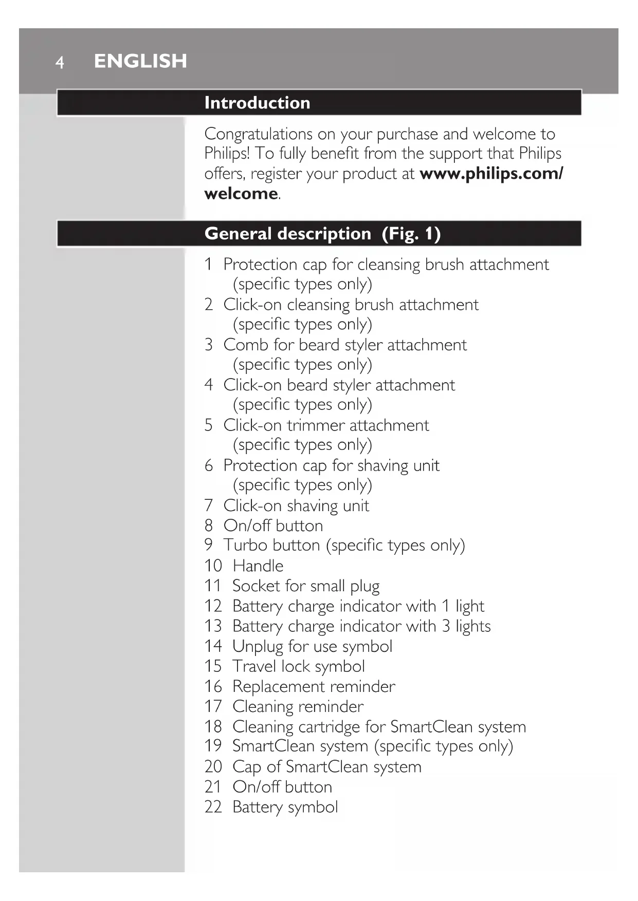 Introduction Congratulations on your purchase and welcome to Philips! To fully benet from the support that Philips offers, register your product at www.philips.com/ welcome. General description (Fig. 1) 1 Protection cap for cleansing brush attachment (specic types only) 2 Click-on cleansing brush attachment (specic types only) 3 Comb for beard styler attachment (specic types only) 4 Click-on beard styler attachment (specic types only) 5 Click-on trimmer attachment (specic types only) 6 Protection cap for shaving unit (specic types only) 7 Click-on shaving unit 8 On/off button 9 Turbo button (specic types only) 10 Handle 11 Socket for small plug 12 Battery charge indicator with 1 light 13 Battery charge indicator with 3 lights 14 Unplug for use symbol 15 Travel lock symbol 16 Replacement reminder 17 Cleaning reminder 18 Cleaning cartridge for SmartClean system 19 SmartClean system (specic types only) 20 Cap of SmartClean system 21 On/off button 22 Battery symbol ENGLISH23 Cleaning symbol 24 Replacement symbol 25 Ready symbol 26 Adapter 27 Small plug 28 Pouch (specic types only) Note: The accessories supplied may vary for different products. The box shows the accessories that have been supplied with your appliance. Important safety information Read this important information carefully before you use the appliance and its accessories and save it for future reference. The accessories supplied may vary for different products. Danger - Keep the adapter dry. Warning - The adapter contains a transformer. Do not cut off the adapter to replace it with another plug, as this causes a hazardous situation. - This appliance can be used by children aged from 8 years and above and persons with reduced physical, sensory or mental capabilities or lack of experience and knowledge if they have been given supervision or instruction concerning use of the appliance in a safe way and understand the hazards involved. Children shall not play with the appliance. Cleaning and user maintenance shall not be made by children without supervision. - Always unplug the shaver before you clean it under the tap. - Always check the appliance before you use it. Do not use the appliance if it is damaged, as this may cause injury. Always replace a damaged part with one of the original type. ENGLISH 5Caution - Never immerse the cleaning system or the charging stand in water and do not rinse it under the tap. - Never use water hotter than 80°C to rinse the shaver. - Only use this appliance for its intended purpose as shown in the user manual. - For hygienic reasons, the appliance should only be used by one person. - Do not use the adapter in or near wall sockets that contain or have contained an electric air freshener to prevent irreparable damage to the adapter. - Never use compressed air, scouring pads, abrasive cleaning agents or aggressive liquids such as petrol or acetone to clean the appliance. - If your shaver comes with a cleaning system, always use the original Philips cleaning uid (cartridge or bottle, depending on the type of cleaning system). - Always place the cleaning system on a stable, level and horizontal surface to prevent leakage. - If your cleaning system uses a cleaning cartridge, always make sure that the cartridge compartment is closed before you use the cleaning system to clean or charge the shaver. - When the cleaning system is ready for use, do not move it to prevent leakage of cleaning uid. - Water may drip from the socket at the bottom of the shaver when you rinse it. This is normal and not dangerous because all electronics are enclosed in a sealed power unit inside the shaver. Electromagnetic elds (EMF) - This Philips appliance complies with all applicable standards and regulations regarding exposure to electromagnetic elds. ENGLISH6General - This shaver is waterproof. It is suitable for use in the bath or shower and for cleaning under the tap. For safety reasons, the shaver can therefore only be used without cord. - The appliance is suitable for mains voltages ranging from 100 to 240 volts. - The adapter transforms 100-240 volts to a safe low voltage of less than 24 volts. The display Charging Battery charge indicator with 3 lights - Charging takes approx. 1 hour - Quick charge: When the appliance is connected to the mains, the lights of the battery charge indicator light up one after the other continuously. When the appliance contains enough energy for one shave, the bottom light of the battery charge indicator ashes slowly. - If you leave the appliance connected to the mains, the charging process continues. To indicate that the appliance is charging, rst the bottom light ashes and then lights up continuously. Then the second light ashes and then lights up continuously, and so on until the appliance is fully charged. Battery charge indicator with 1 light - Charging takes approx. 1 hour. ENGLISH 7- Quick charge: When the appliance does not contain enough energy for one shave, the battery charge indicator ashes quickly. When the battery charge indicator starts ashing slowly, the appliance contains enough energy for one shave . - If you leave the appliance connected to the mains, the charging process continues. To indicate that the appliance is charging, the battery charge indicator ashes slowly. Battery fully charged Note: This appliance can only be used without cord. Note: When the battery is full, the display switches off automatically after 30 minutes. If you press the on/off button during charging, the ‘unplug for use’ symbol ashes white to remind you that you have to disconnect the appliance from the mains. When the battery is fully charged, all lights of the battery charge indicator light up continuously. - Battery charge indicator with 3 lights - Battery charge indicator with 1 light Battery low When the battery is almost empty, the battery charge indicator ashes orange. ENGLISH8- Battery charge indicator with 3 lights - Battery charge indicator with 1 light Remaining battery capacity Batte