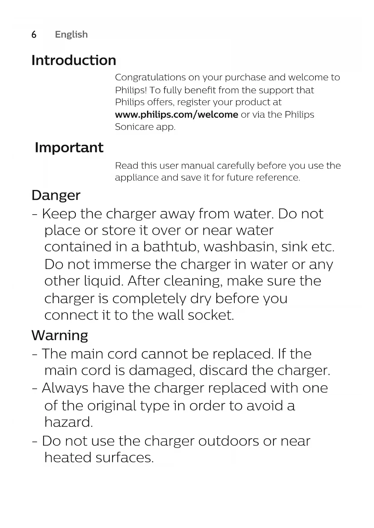 170English Introduction Congratulations on your purchase and welcome to Philips! To fully benefit from the support that Philips offers, register your product at www.philips.com/welcome or via the Philips Sonicare app. Important Read this user manual carefully before you use the appliance and save it for future reference. Danger - Keep the charger away from water. Do not place or store it over or near water contained in a bathtub, washbasin, sink etc. Do not immerse the charger in water or any other liquid. After cleaning, make sure the charger is completely dry before you connect it to the wall socket. Warning - The main cord cannot be replaced. If the main cord is damaged, discard the charger. - Always have the charger replaced with one of the original type in order to avoid a hazard. - Do not use the charger outdoors or near heated surfaces.