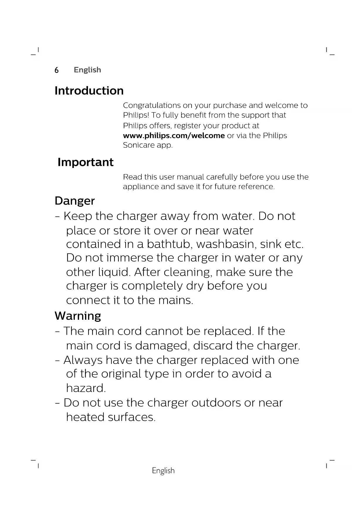 171English Introduction Congratulations on your purchase and welcome to Philips! To fully benefit from the support that Philips offers, register your product at www.philips.com/welcome or via the Philips Sonicare app. Important Read this user manual carefully before you use the appliance and save it for future reference. Danger - Keep the charger away from water. Do not place or store it over or near water contained in a bathtub, washbasin, sink etc. Do not immerse the charger in water or any other liquid. After cleaning, make sure the charger is completely dry before you connect it to the mains. Warning - The main cord cannot be replaced. If the main cord is damaged, discard the charger. - Always have the charger replaced with one of the original type in order to avoid a hazard. - Do not use the charger outdoors or near heated surfaces.