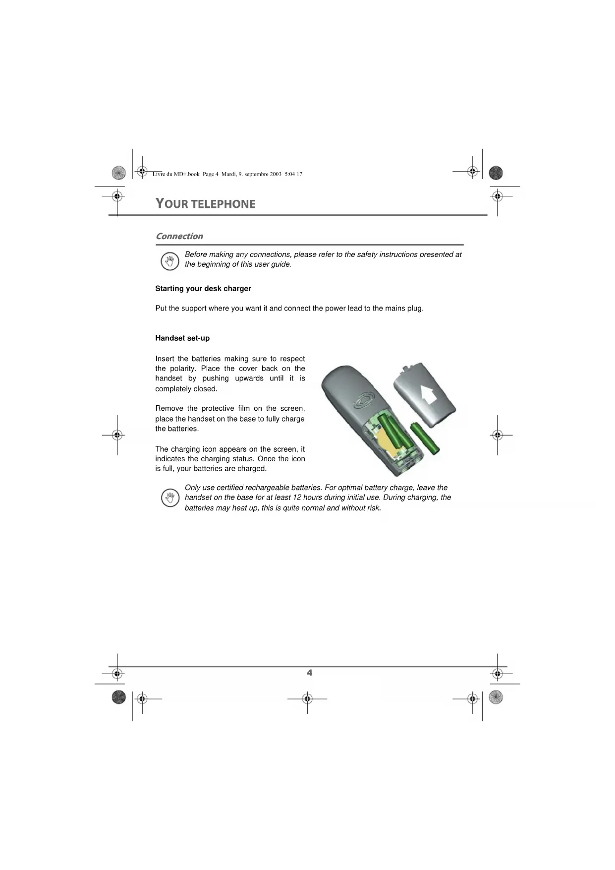 HANDSET -1- 11 Mar 16:44 In useAnswer only On New answering machine messageHandsfree Name of the base or handset Livre du MD+.book Page 3 Mardi, 9. septembre 2003 5:04 174 YOUR TELEPHONE Connection Starting your desk charger Put the support where you want it and connect the power lead to the mains plug. Handset set-up Insert the batteries making sure to respect the polarity. Place the cover back on the handset by pushing upwards until it is completely closed. Remove the protective film on the screen, place the handset on the base to fully charge the batteries. The charging icon appears on the screen, it indicates the charging status. Once the icon is full, your batteries are charged. Before making any connections, please refer to the safety instructions presented at the beginning of this user guide. Only use certified rechargeable batteries. For optimal battery charge, leave the handset on the base for at least 12 hours during initial use. During charging, the batteries may heat up, this is quite normal and without risk. Livre du MD+.book Page 4 Mardi, 9. septembre 2003 5:04 175 YOUR TELEPHONE Replacing the batteries Rechargeable batteries must be used with your handset. Proceed as follows: Take the handset and turn it around so that the battery compartment is accessible. Insert a sharp object (pen, paper clip...) perpendicularly in hole 1 as shown in the illustration and lift it upwards, slide it downwards as shown by marker 2 and do exactly what is explained in the previous paragraph.