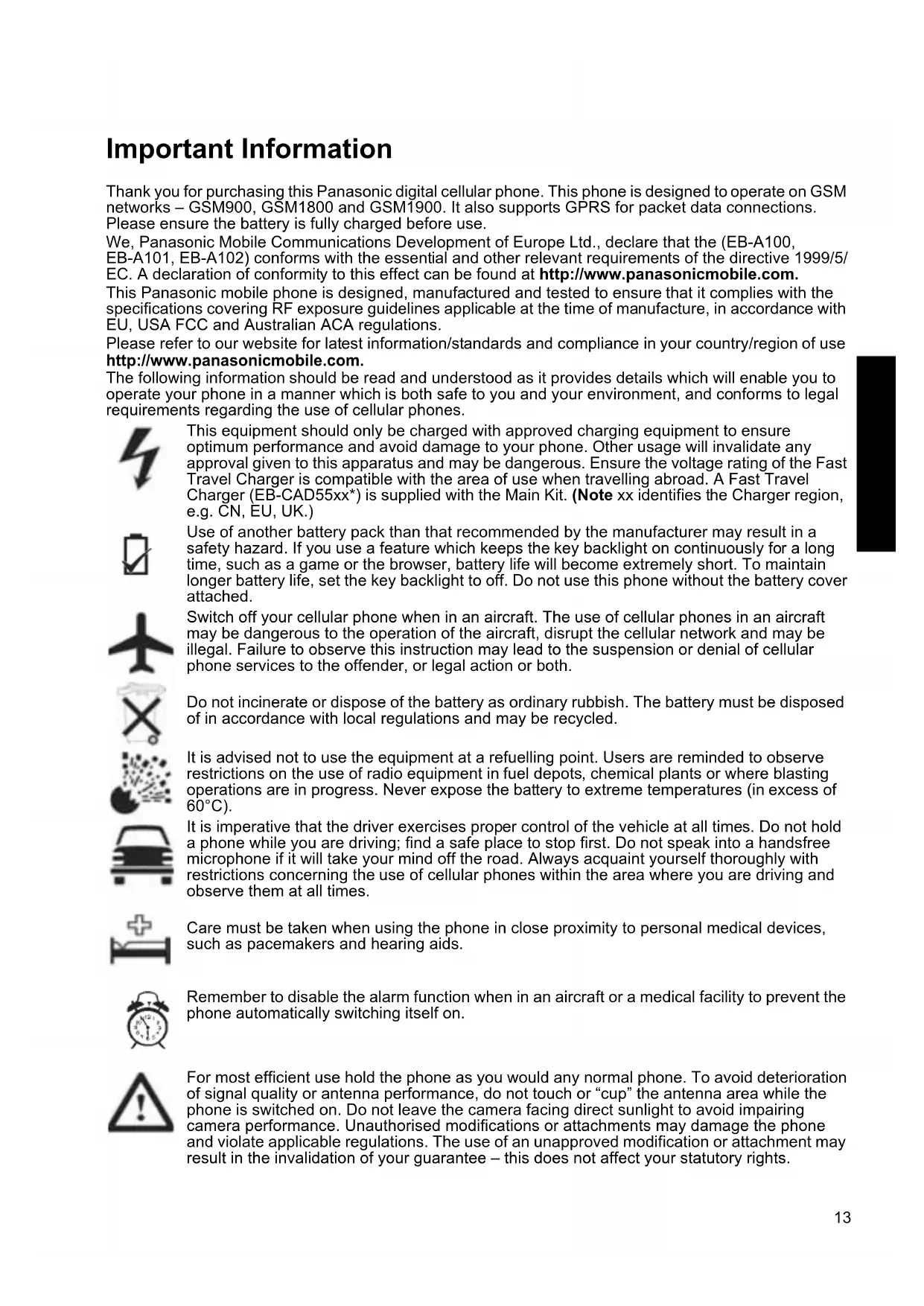 This Panasonic mobile phone is designed, manufactured and tested to ensure that it complies with the specifications covering RF exposure guidelines applicable at the time of manufacture, in accordance with EU, USA FCC and Australian ACA regulations.