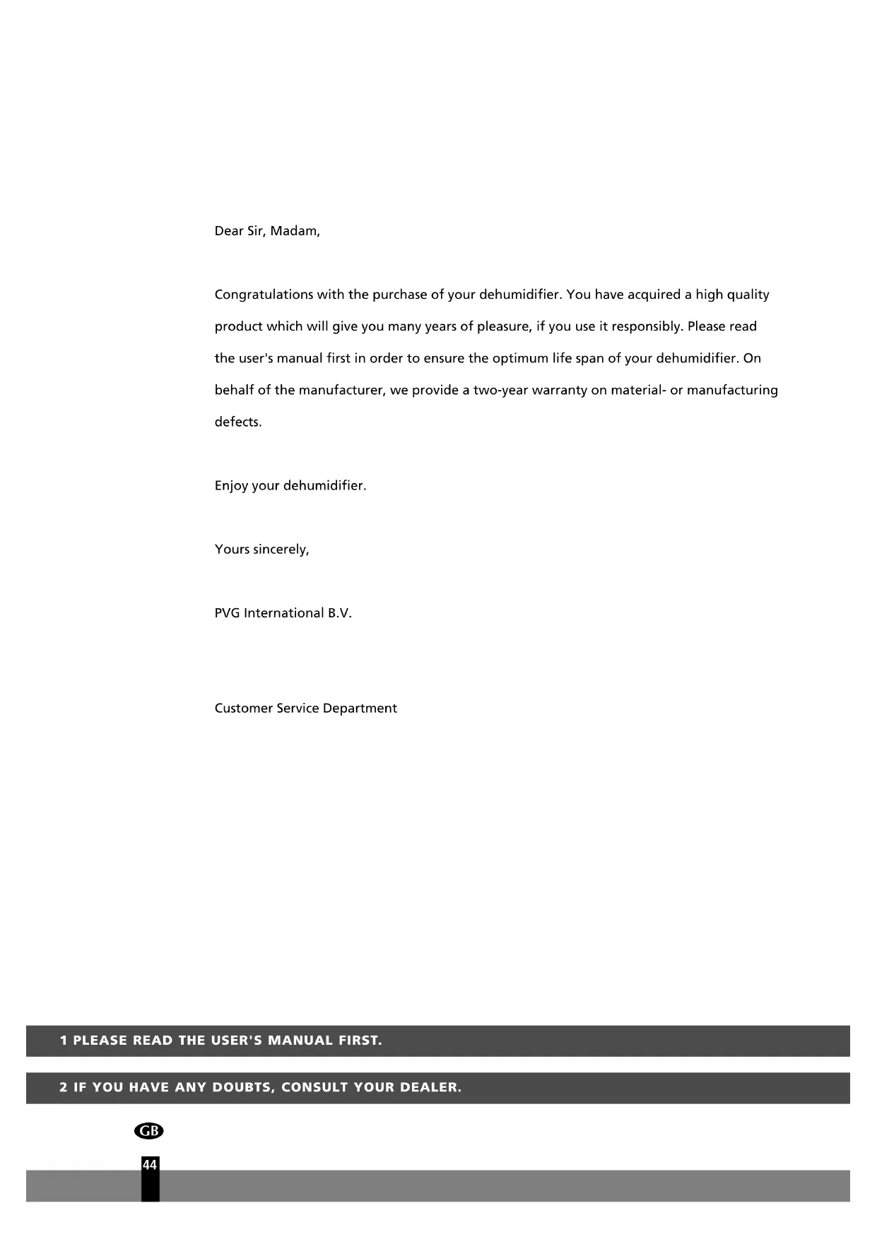 Dear Sir, Madam, Congratulations with the purchase of your dehumidifier. You have acquired a high quality product which will give you many years of pleasure, if you use it responsibly. Please read the user's manual first in order to ensure the optimum life span of your dehumidifier. On behalf of the manufacturer, we provide a two-year warranty on material- or manufacturing defects. Enjoy your dehumidifier. Yours sincerely, PVG International B.V. Customer Service DepartmentI MPORTANT COMPONENTS Control panel Adjustment button/hydrostat Dry air outlet Removable water container Humid air inlet Air filter Drain spout (ø13 mm) with cap Plug and cord Handle