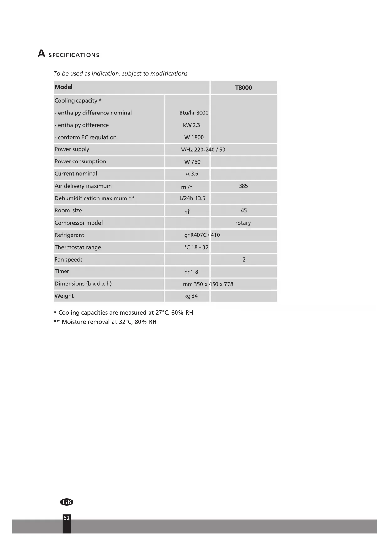 - Cooling capacities are measured at 27°C, 60% RH ** Moisture removal at 32°C, 80% RH Model T8000 Cooling capacity *- enthalpy difference nominal Btu/hr 8000 - enthalpy difference kW 2.3 - conform EC regulation W 1800 Power supply V/Hz 220-240 / 50 Power consumption W 750 Current nominal A 3.6 Air delivery maximum