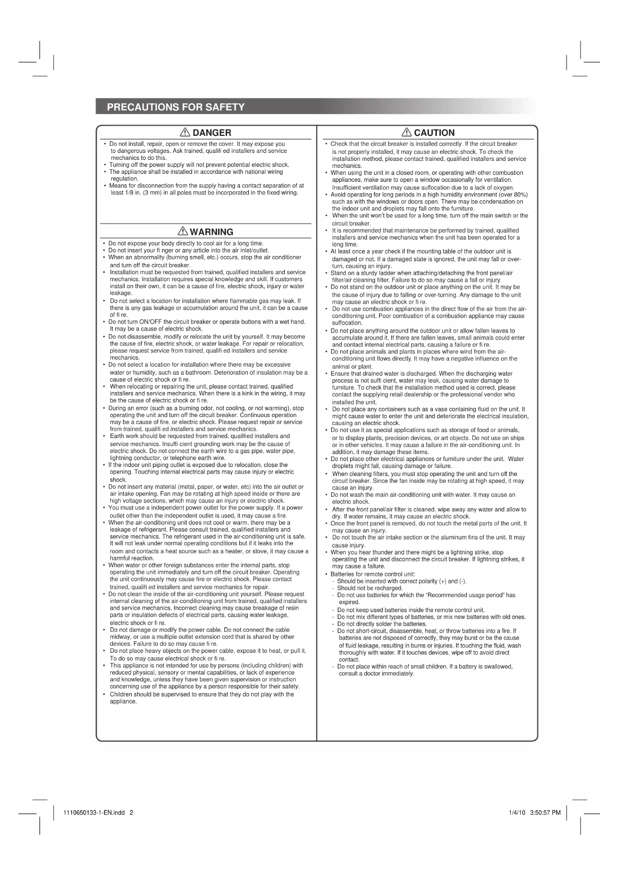 - Batteries for remote control unit: - Should be inserted with correct polarity (+) and (-). - Should not be recharged. - Do not use batteries for which the “Recommended usage period” has expired. - Do not keep used batteries inside the remote control unit. - Do not mix different types of batteries, or mix new batteries with old ones. - Do not directly solder the batteries. - Do not short-circuit, disassemble, heat, or throw batteries into a fire. If batteries are not disposed of correctly, they may burst or be the cause of fluid leakage, resulting in burns or injuries. If touching the fluid, wash thoroughly with water. If it touches devices, wipe off to avoid direct contact. - Do not place within reach of small children. If a battery is swallowed, consult a doctor immediately. 1110650133-1-EN.indd 21110650133-1-EN.indd 2 1/4/10 3:50:57 PM1/4/10 3:50:57 PMEN