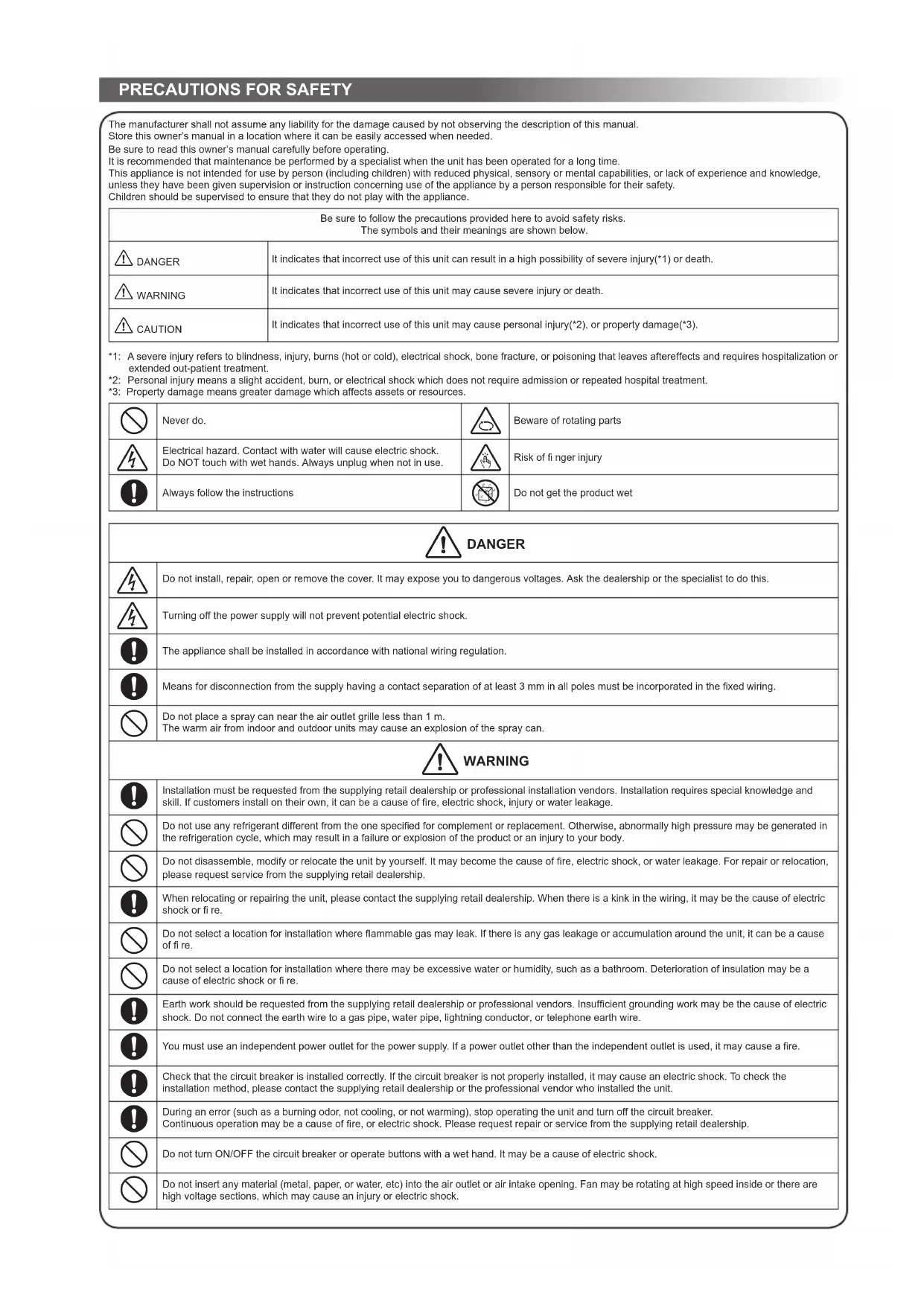 The manufacturer shall not assume any liability for the damage caused by not observing the description of this manual.Store this owner’s manual in a location where it can be easily accessed when needed.Be sure to read this owner’s manual carefully before operating.It is recommended that maintenance be performed by a specialist when the unit has been operated for a long time. This appliance is not intended for use by person (including children) with reduced physical, sensory or mental capabilities, or lack of experience and knowledge, unless they have been given supervision or instruction concerning use of the appliance by a person responsible for their safety. Children should be supervised to ensure that they do not play with the appliance.Be sure to follow the precautions provided here to avoid safety risks.The symbols and their meanings are shown below. 0 DANGER It indicates that incorrect use of this unit can result in a high possibility of severe injury(*1) or death. 0 WARNING It indicates that incorrect use of this unit may cause severe injury or death. 0 CAUTION It indicates that incorrect use of this unit may cause personal injury(*2), or property damage(*3). *1: A severe injury refers to blindness, injury, burns (hot or cold), electrical shock, bone fracture, or poisoning that leaves aftereffects and requires hospitalization or extended out-patient treatment. *2: Personal injury means a slight accident, burn, or electrical shock which does not require admission or repeated hospital treatment. *3: Property damage means greater damage which affects assets or resources. Never do. Beware of rotating parts Electrical hazard. Contact with water will cause electric shock.Do NOT touch with wet hands. Always unplug when not in use. Risk of fi nger injury Always follow the instructions Do not get the product wet