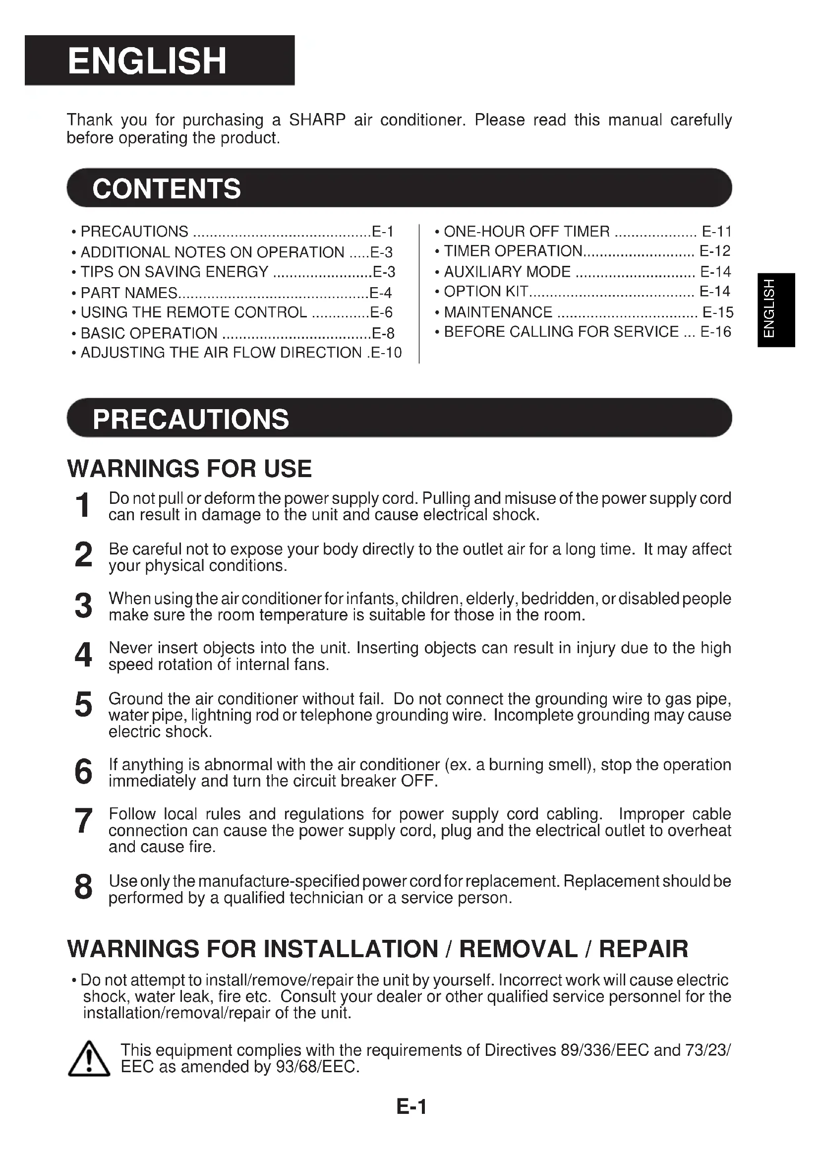 - Do not attempt to install/remove/repair the unit by yourself. Incorrect work will cause electricshock, water leak, fire etc. Consult your dealer or other qualified service personnel for theinstallation/removal/repair of the unit.This equipment complies with the requirements of Directives 89/336/EEC and 73/23/EEC as amended by 93/68/EEC.PRECAUTIONS