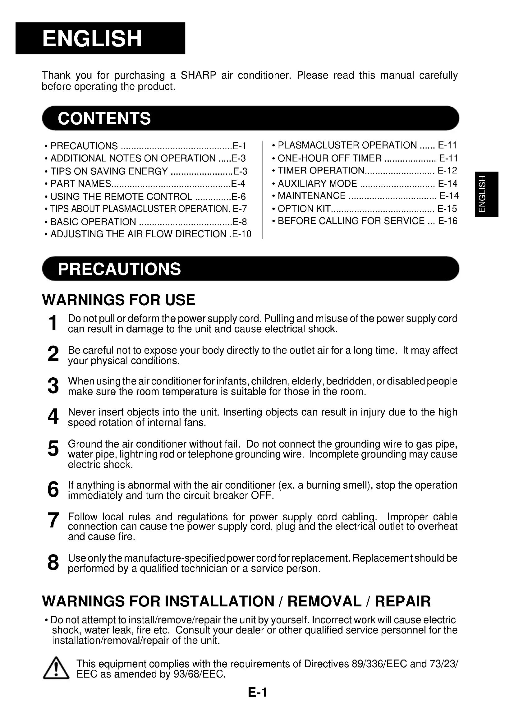 - Do not attempt to install/remove/repair the unit by yourself. Incorrect work will cause electricshock, water leak, fire etc. Consult your dealer or other qualified service personnel for theinstallation/removal/repair of the unit.This equipment complies with the requirements of Directives 89/336/EEC and 73/23/EEC as amended by 93/68/EEC.PRECAUTIONS