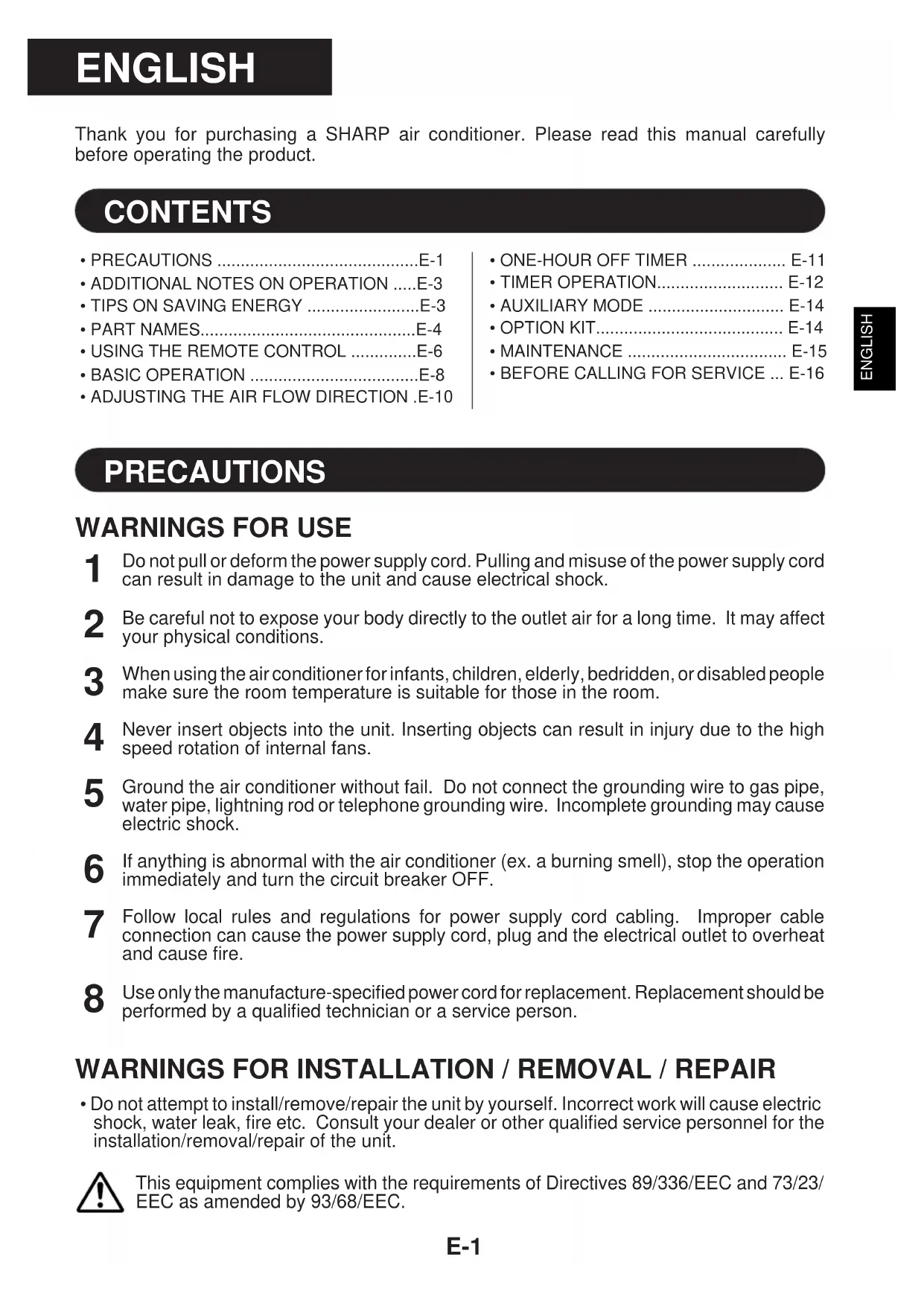 - Do not attempt to install/remove/repair the unit by yourself. Incorrect work will cause electricshock, water leak, fire etc. Consult your dealer or other qualified service personnel for theinstallation/removal/repair of the unit.This equipment complies with the requirements of Directives 89/336/EEC and 73/23/EEC as amended by 93/68/EEC.PRECAUTIONS