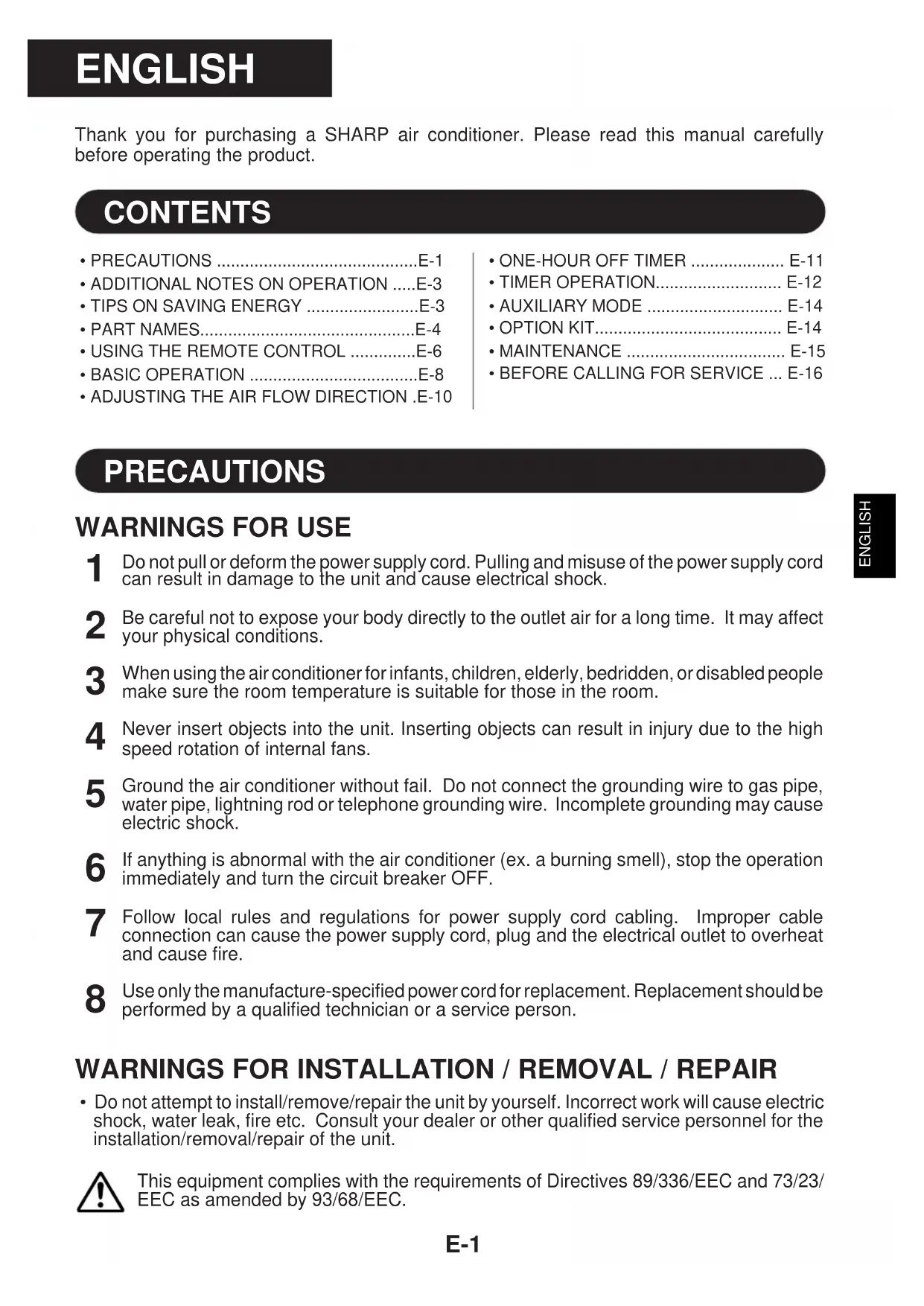 - Do not attempt to install/remove/repair the unit by yourself. Incorrect work will cause electric shock, water leak, fire etc. Consult your dealer or other qualified service personnel for theinstallation/removal/repair of the unit.This equipment complies with the requirements of Directives 89/336/EEC and 73/23/EEC as amended by 93/68/EEC.PRECAUTIONS