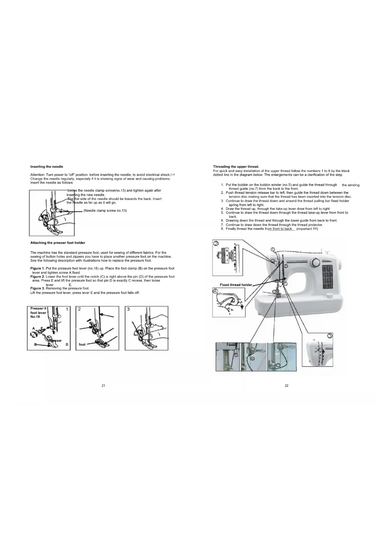 On/off switch21 Inserting the needle Attention: Turn power to “off” position before inserting the needle, to avoid electrical shock.!~! Change the needle regularly, especialy if it is showing signs of wear and causing problems. Insert the needle as follows: Loose the needle clamp screw(no.13) and tighten again after inserting the new needle. The flat side of the needle should be towards the back. Insert the needle as far up as it will go. (Needle clamp screw no.13)