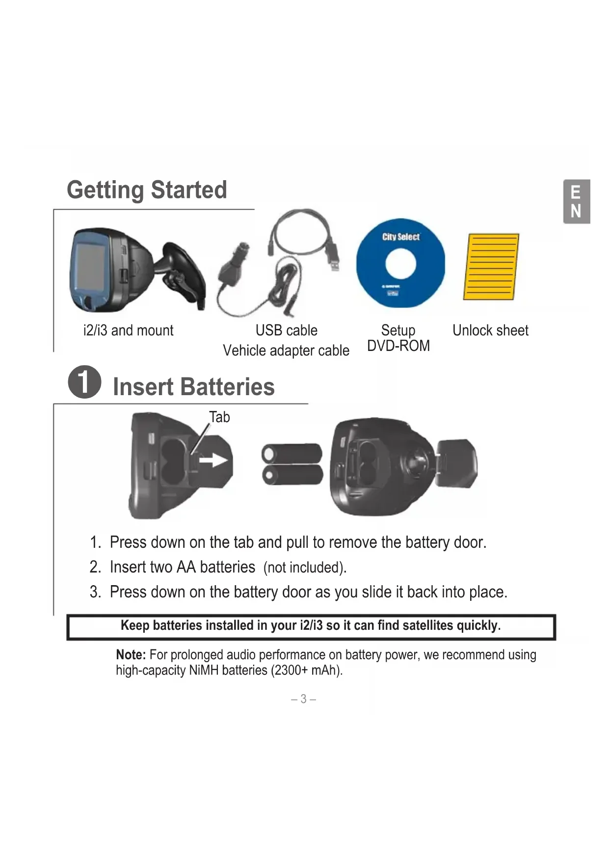 Tab Note: For prolonged audio performance on battery power, we recommend using high-capacity NiMH batteries (2300+ mAh).Keep batteries installed in your i2/i3 so it can find satellites quickly. Setup DVD-ROM Unlock sheet USB cable Vehicle adapter cable i2/i3 and mountE